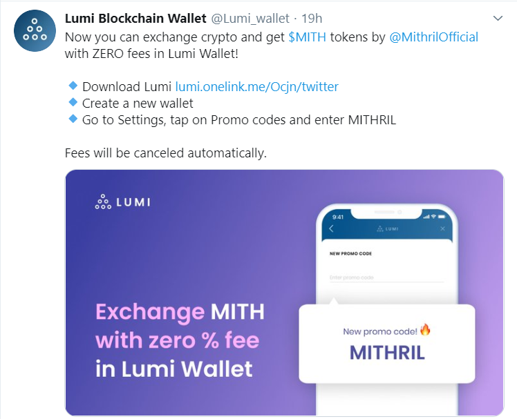 We are thrilled to announce that you can now exchange and get MITH with zero fees on Lumi Wallet!