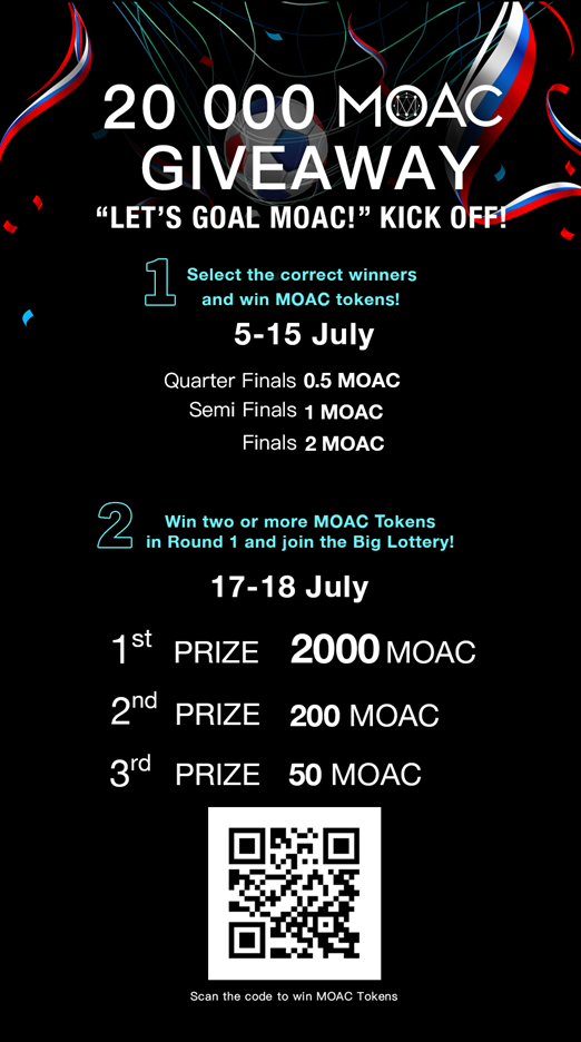 As the World Cup is reaching its climax MOAC Blockchain Co is excited to get you hooked on this World Cup gig now that we got to the semi finals with its “LUCKY DRAW” Event that is is still on during the competition. Lucky winners will be awarded 50 to 2000 MOAC token at the grand draw after the finale.