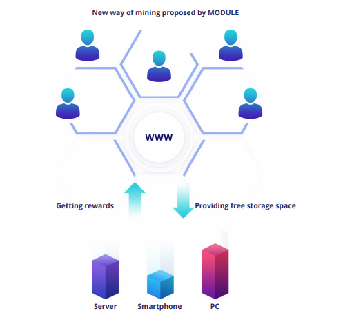 Module представляет собой платформу, где любой пользователь смартфона, планшета или персонального компьютера, установив соответствующее приложение, сможет зарабатывать токены, выделив программе определенное место в памяти своего устройства на определенный срок времени. Это место будет вовлечено в сеть облачного хранилища для кодированной информации, предоставленной на хранение желающими на основе р2р (равный равному) смарт-контрактов.