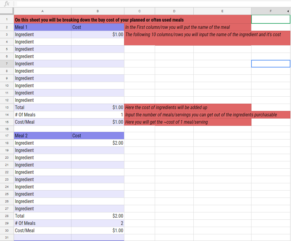 On the first page you make a list of your meals along with their ingredient costs and how many servings you get from those ingredients. This page is also where you will see the approximate cost of each individual meal/serving (based on the buying cost and number of servings).