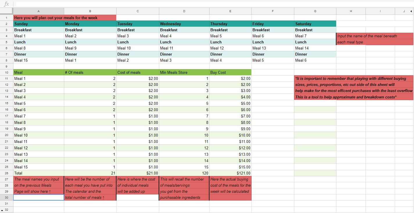 On the second page you will fill out the weekly calendar with the meals you intend on having on each day/for each meal. The table will then calculate how much it will cost you in total to actually buy food needed for the meals you intend on having.