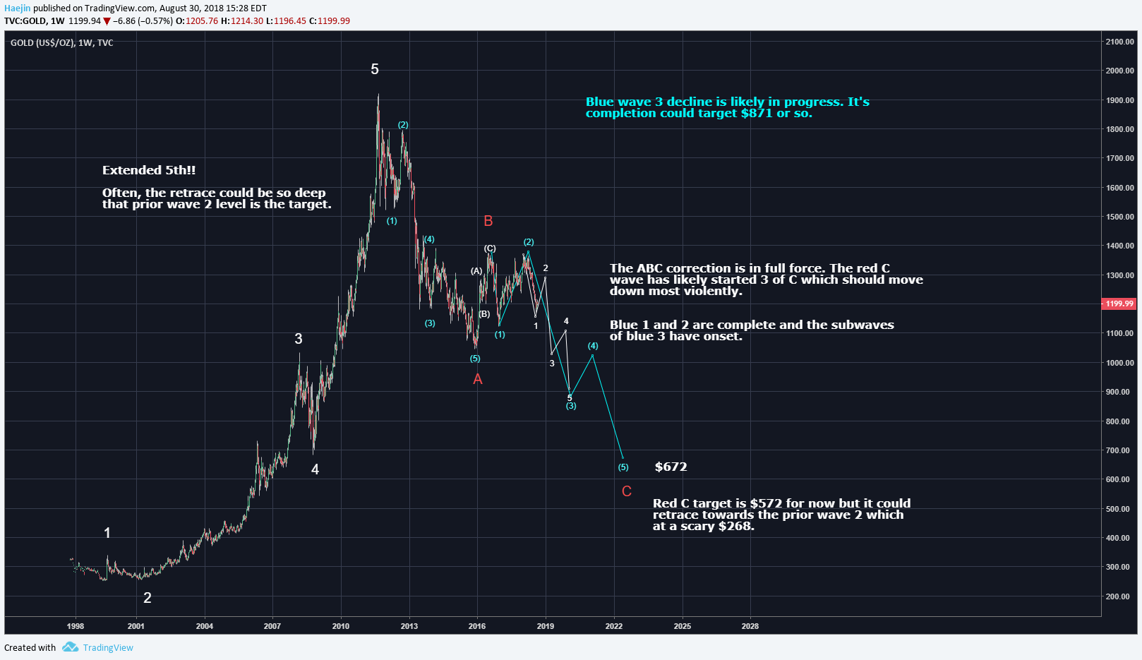I've been a gold bear since 2011, but I never gave it a chance to fall that far. Definitely possible thought and it is what the wave count says. What does your wave count say for the future of Bitcoin/USD? I have not seen an update on that for awhile.