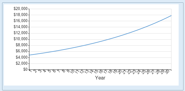 This pattern will continue for the life of the mortgage. Each payment will reduce the rate at which interest is accrued. This in turn means that each payment pays off a little more principal. Over time this will accelerate and the home loan will reduce at an increasing rate. This is due to the effect of compound interest. The chart below shows how much principal Mr. Borrower would repay in each year of his mortgage: