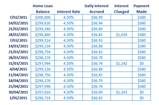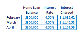 Imagine Mr. Borrower, owes $300,000 on his mortgage and his interest rate is 4.50%. Every day he would accrue interest of around $36.99. If he decides to only make interest only payments, then the interest he would be charged would vary slightly from month to month, depending on how many days are in that month. This is illustrated in the table below: