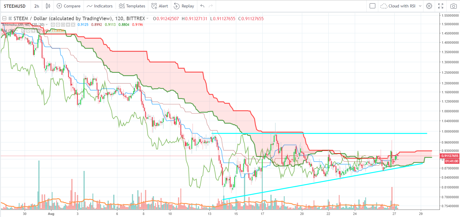 STEEM had a fairly large increase in volume today. That is a good sign. We can see a huge spike in volume around 20 UTC and a large bar up to 96 cents. That could be considered a breakout on the 30 minute chart. As we had seen some previous hits but no large breakouts supported by much volume. However, if we move to the higher time frame, 2 two hour, we see that it broke out of Leading Span B but came back into the cloud. The more times price tests those levels means the more likely they are to break. And seeing it supported by volume is very positive. Currently, on the 30 min time frame we are seeing price remain above both Spans and hopefully it will be supported by those Spans. However, it looks like the 30 min frame is more volatile and often breaks the support and resistances levels the Ichimoku cloud outlines. But the 2 hour time frame looks like it generally respects those levels. If i were trading here I'd look for a price breakout on the 2 hour time frame and buy in. As my cloud settings are set for double time crypto - We are seeing the 1 hour cloud in the 30 min time frame, the 4 hour cloud in the two hour time frame. This reduces false signals. Although, it's still not perfect.