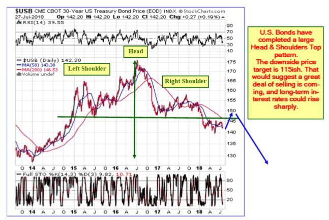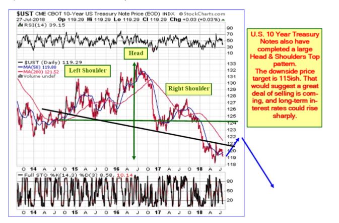 U.S. Bonds have completed a large Bearish Head & Shoulders Top pattern. The downside price target is 115ish, suggesting a ton of selling is about to hit the U.S. Bond market. Long-term interest rates could rise.