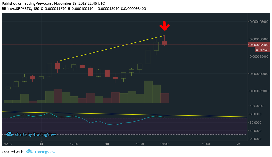 XRPBTC looks like it could retrace some before new fuel to test resistance. Bear divs on 3H & 6H, and just now printing a shooting star on 3H.