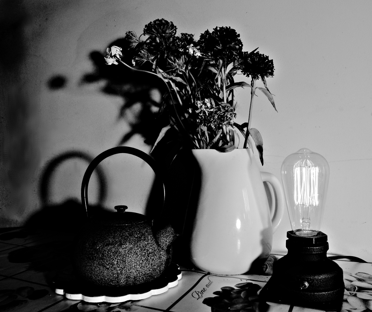 Dry flowers in a white jugfooblic (56)in #monochromemonday • 8 years ago (Nikon Coolpix: f/5.5, 1/6 s, ISO 100, -1.3EV) More B&W flowers #photography #photomatic #photocircle #photofeed