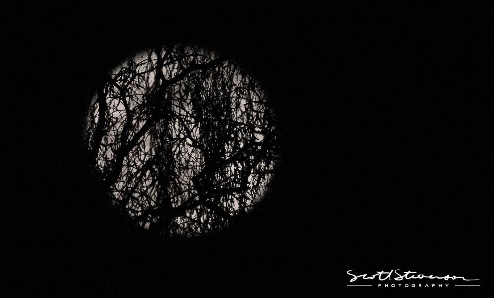 As I was heading back to the truck I notice the light of the moon illuminating the branches of the trees on the street. It was dark enough that only the circle of the moon highlighted the branches. Very cool.