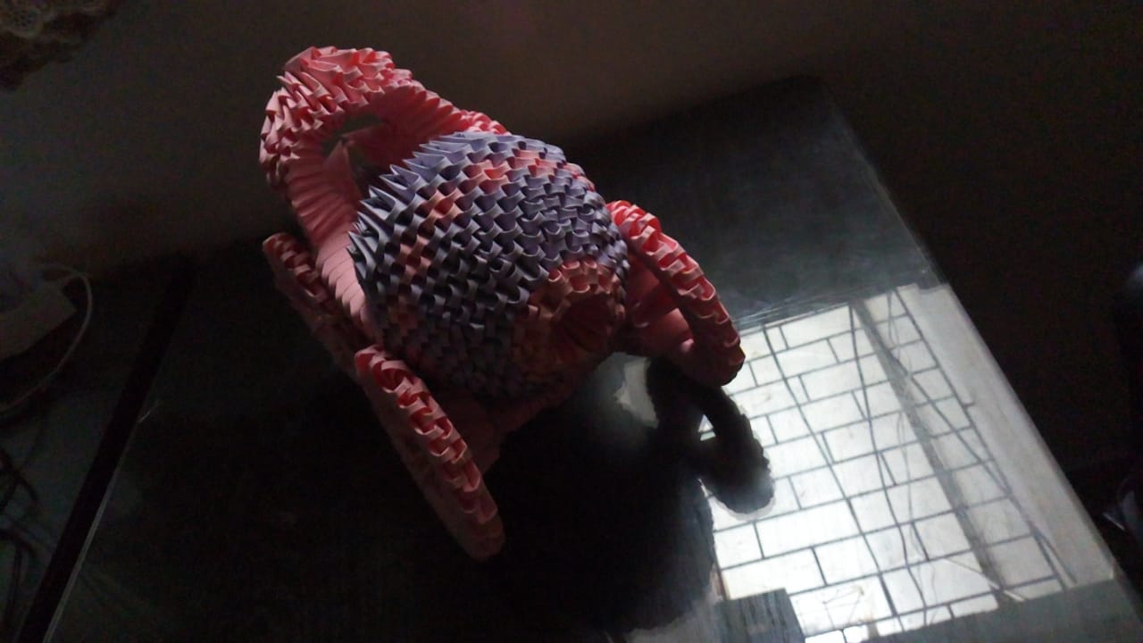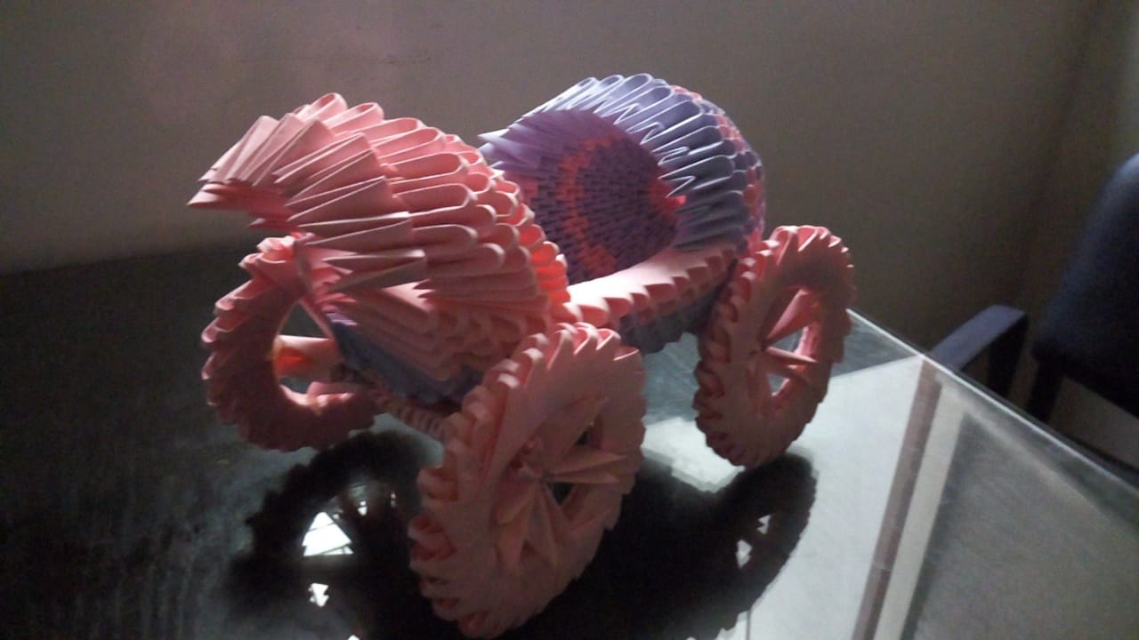 This 3D origami baby carriage model is made from around 700 purple and 500 pink pieces.