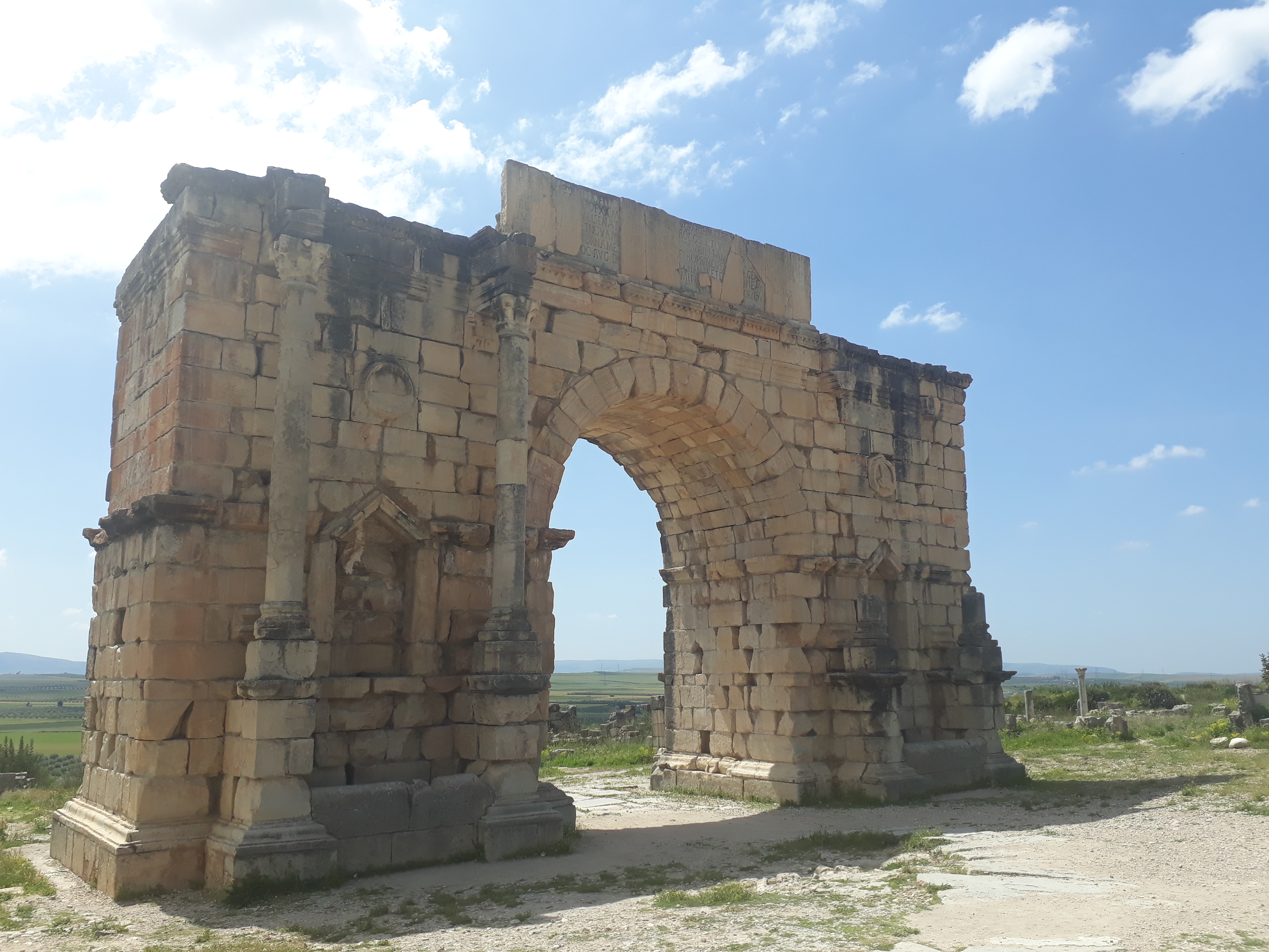 volubilis is an ancient Berber city, then Romanized, An archaeological site registered in 1997 on the World Heritage Site located in Morocco near the city of Meknes, The city has many buildings: temples, courtyard, baths, Arc de Triomphe and only houses decorated with mosaics, and the olive presses.