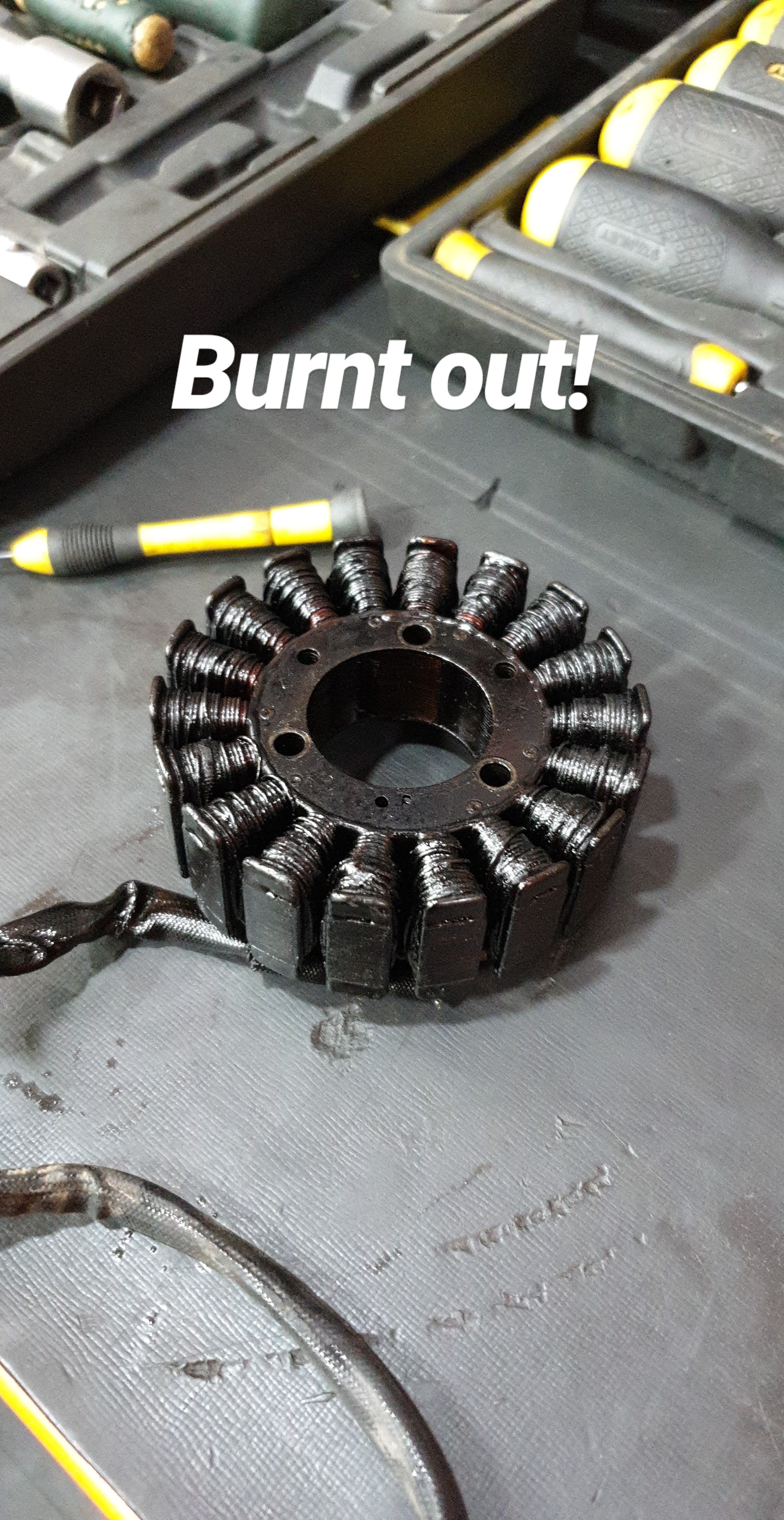 It was when I took the bike to the service center and they opened up the stator casing that we found out that it was completely burnt. You can see it in one of the images below.