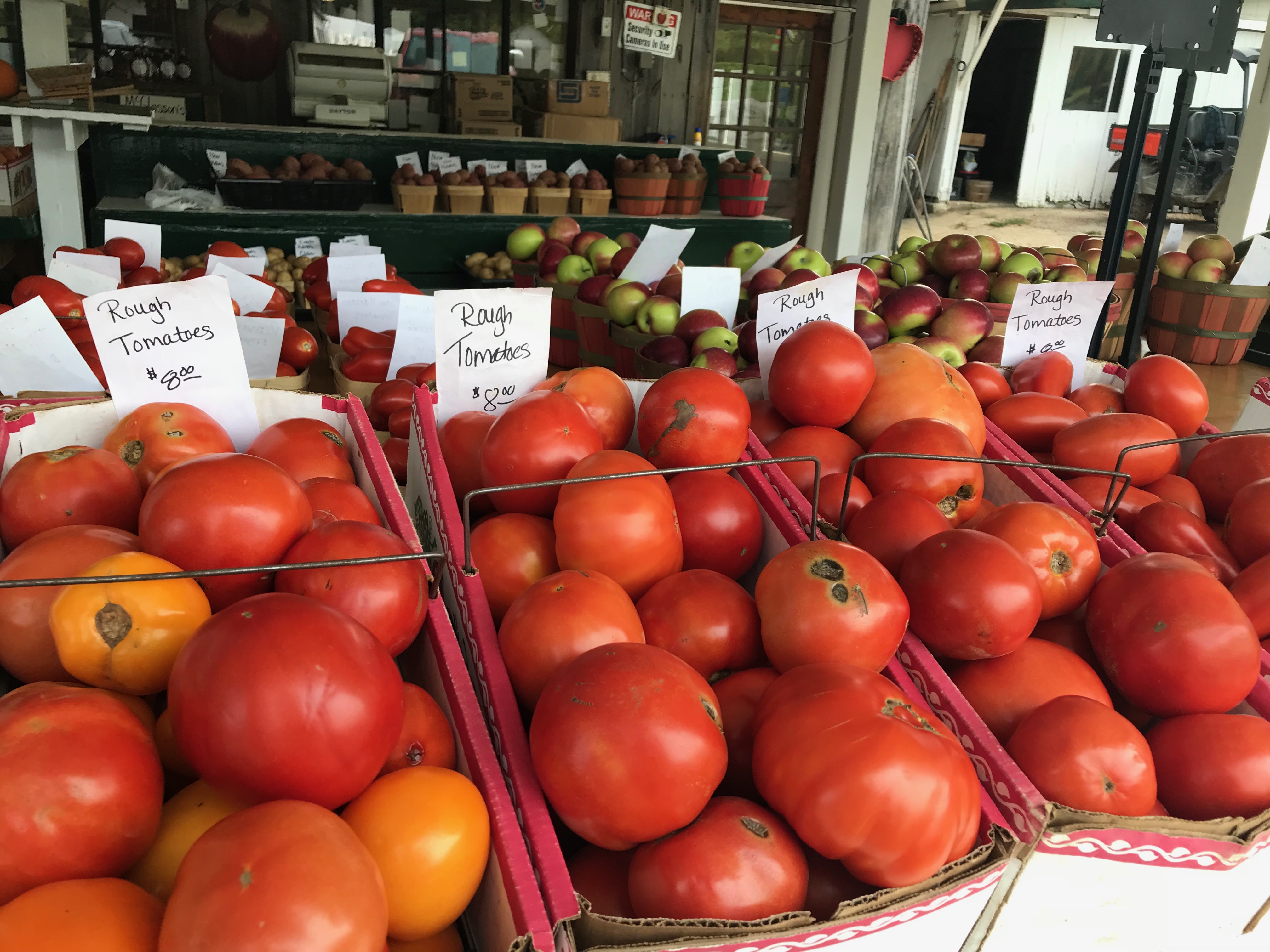 After we disembarked the Ferry, McGlasson Fruit Farm was just a few miles down and on our right. I'll be honest, I was expecting something...more. I found this place by posting a Facebook request asking for pick-your-own-peach destinations, and in my mind I would walk down aisles of trees and plucking off big, fat, juicy peaches. This wasn't the case and I want to set your expectations if you go. There weren't any goats or farm dogs wandering about. What they DID have were tables piled high of local, fresh produce. You could smell the tomatoes when you walked by the table, no antiseptic, hard-as-a-rock, mealy, tasteless specimens here. Only genuine, bona fide, old-fashioned love apples. You had your pick of those, too.