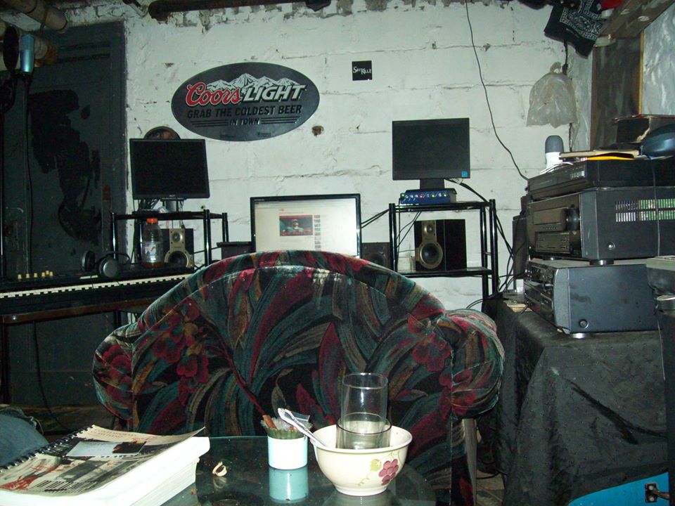 TOOK A SHOT OF MY FRIENDS BASEMENT STUDIO THE ATMOSPHERE IS ALWAYS COOL HERE WE GET ALOT OF WORK DONE AN THE MUSIC COMES OUT GREAT THIS RIGHT HERE IS THE COCK PIT HIS SOFA LOUNGE CHAIR AN WORK STATION WHERE ALL HIS EQUIPMENT IS PLACED FUN PLACE TO BE IN