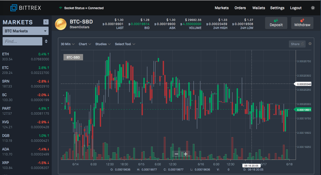 ယမန္ေန႔က USD $ 1.25 အထိက်ဆင္းသြားခဲ့ေသာ SBD သည္ Bittrex ေစ်းကြက္ အတြင္း၌ ယခုလ၏ အနိမ့္ဆံုး ျဖစ္ေသာ ဝယ္ေရာင္းပမာဏေဒၚလာ ၂ ေသာင္း ေက်ာ္သာရွိခဲ့ကာ လက္ရွိ အခ်ိန္တြင္ SBD မွာ USD $ 1.30 ဝန္းက်င္တြင္ ေစ်းၿငိမ္လ်က္ရွိေနပါသည္။ SBD ေစ်းအေနျဖင့္ HitBTC ေစ်းကြက္တြင္ USD $26 အထိ အတက္ျပေနၿပီ ျဖစ္ေသာ္လည္း Deposit သြင္းမရဟု သိရပါသည္။