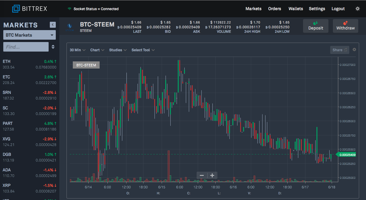 ယမန္ေန႔က USD $1.65 တြင္ ေစ်းၿငိမ္ေနခဲ့ေသာ Steem သည္ Bittrex ေစ်းကြက္ အတြင္း၌ လြန္ခဲ့ေသာ ၂၄ နာရီ အတြင္းဝယ္ေရာင္း ပမာဏ ေဒၚလာ ၁ သိန္းေက်ာ္ခန္႔သာရွိ၍ လက္ရွိအခ်ိန္တြင္ USD$1.65 ဝန္းက်င္ျဖင့္ ဝယ္ေရာင္း ေနၾကၿပီ ျဖစ္ပါသည္။ လက္ရွိ Steem ေစ်းကြက္ အား USTD ျဖင့္ ေရာင္းဝယ္ေသာ Huobi ေစ်းကြက္မွ ၁၈ % ထိန္းခ်ဳပ္ထားၿပီ Steem အေနျဖင့္ coinmarket cap ၏ အဆင့္ ၃၃ ေနရာတြင္ ေရာက္ရွိေနပါသည္။