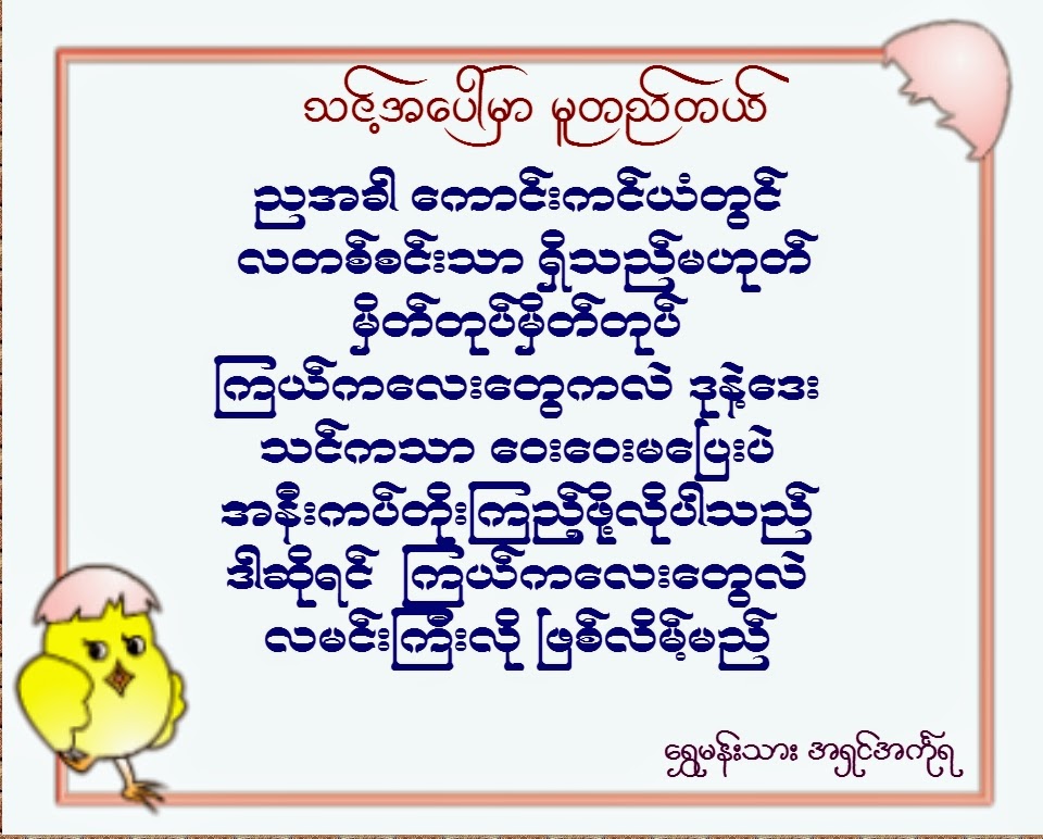 ကြ်န္ေတာ္က အၾကံေပးတာပါ။ တစ္ျခား memberေတြကိုလည္း ကြ်န္ေတာ့္လို တင္ျပေစခ်င္တ့ဲ ရည္ရြယ္ခ်က္နဲ ့ဒီpostကို ေရးသားခ့ဲျခင္းျဖစ္ပါတယ္။ အားလုံးဝိုင္းစဥ္းစားရင္ အေျဖေကာင္းတစ္ခု လုပ္သင့္တ့ဲအလုပ္တစ္ခုေတာ့ ထြက္လာေကာင္းေစခ်င္လို ့။ကိုဟင္ကို ေလးစားလ်က္