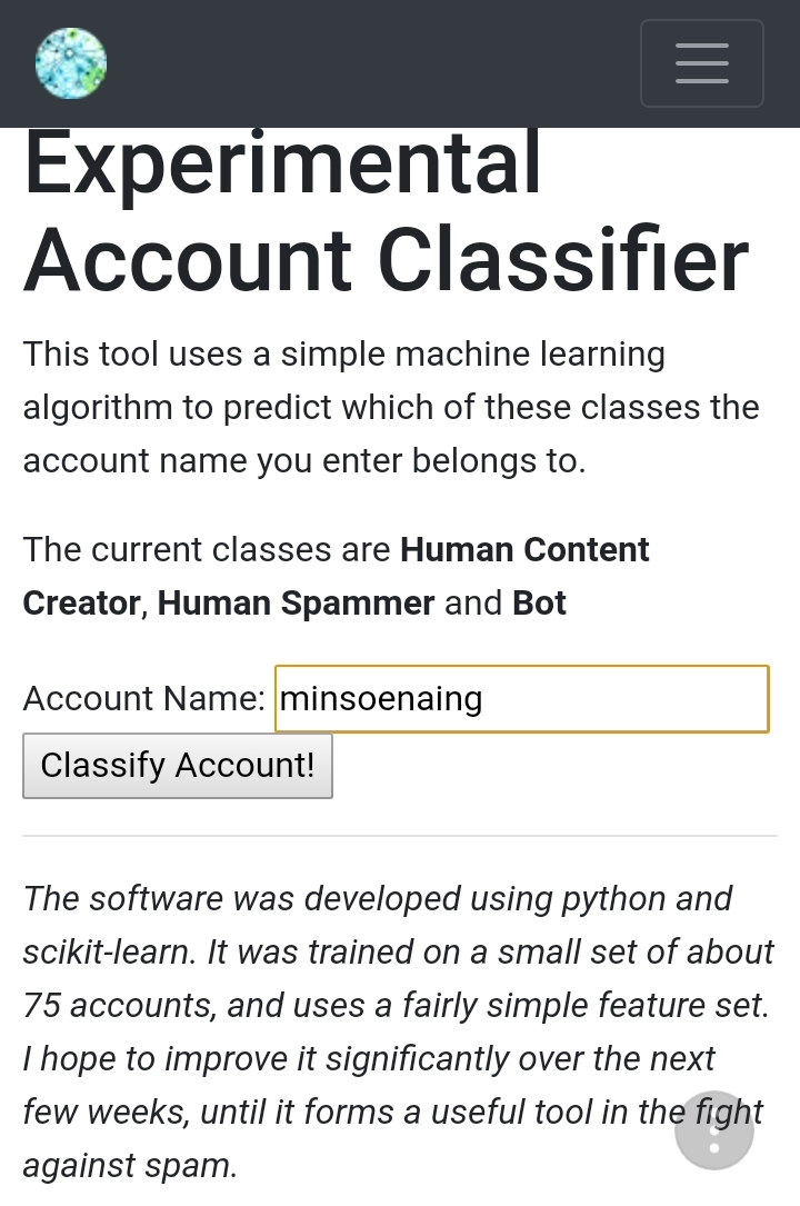ထူးဆန္းတယ္ေနာ္။ မိတ္ေဆြတို႔ေရာ ကၽြန္ေတာ့လိုစစ္ၾကည့္ၾကဦးမလား။ စစ္ၾကည့္မယ္ဆိုရင္ အဲဒီလင့္ ကိုဖြင့္လိုက္။ ကြက္လပ္ကေလးမွာ မိမိ User Name ျဖည့္လိုက္။ေနာက္ Classify account ဆိုတဲ့ ေနရာေလး ကိုႏွိပ္လိုက္ရင္ သင္ ကိုယ္သင္ Bot လား၊ Human လား၊ spammer လားဆိုတာသိသြားမွာပါ။