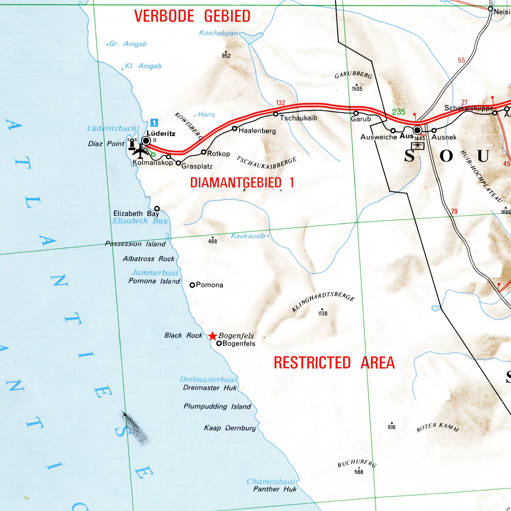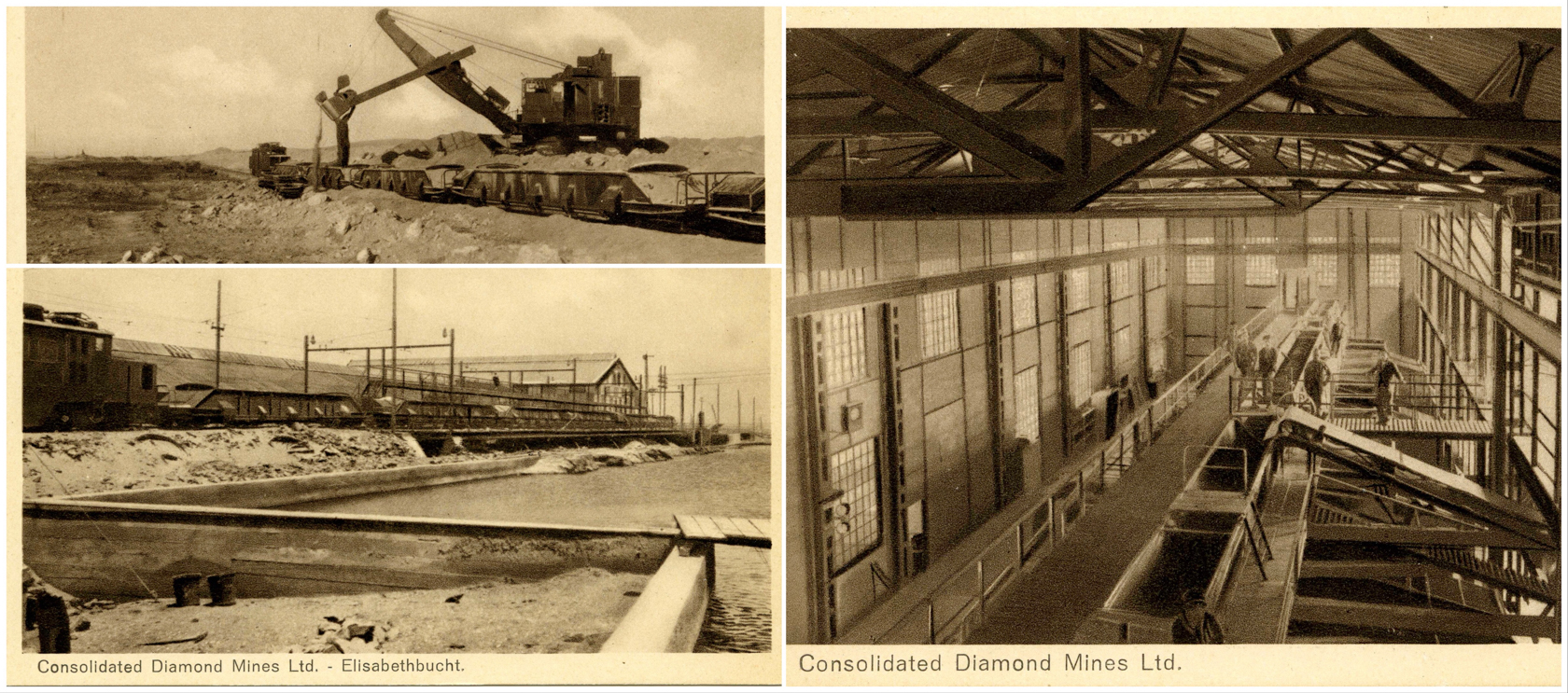 In 1911 an open cast mine was undertaken by the Deutsche Kolonialgesellshaft Sudwestafrika. (DKW) During World War 1 mining was interrupted and after the war the territory was now under the mandate of the League of Nations and administered by South Africa. A second phase of mining now under the control of Consolidated Diamond Mines of SWA known as CDM resumed in the early 1920’s. A huge amount of money was spent on infrastucture up until 1926. A report indicates: due to the completion of the large diamond sorting plant at Elizabethbucht and the power station at Luderitz resulted in a large drop in the importation of mining and electrical plant and material. The value of mining machinery imported during 1926 was 110,092 pounds and in 1927 only 39621 pounds. Other materials such as electric cable and cement showed a similar decrease.