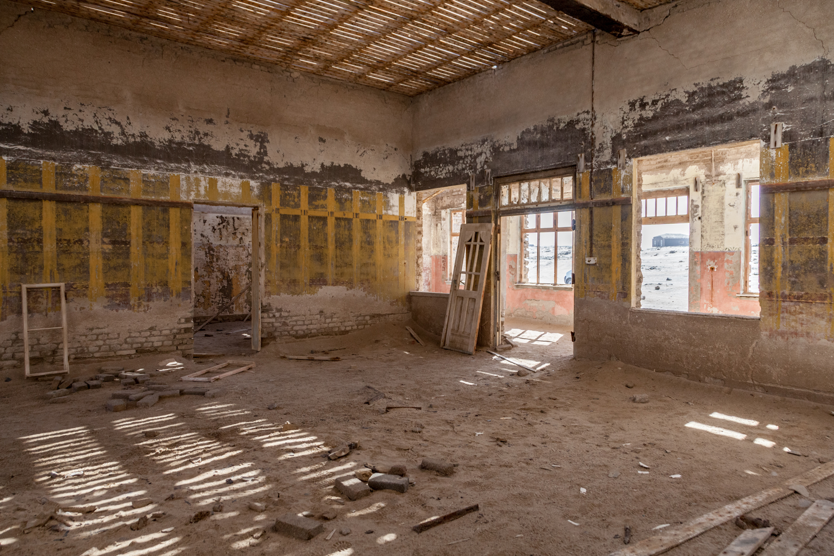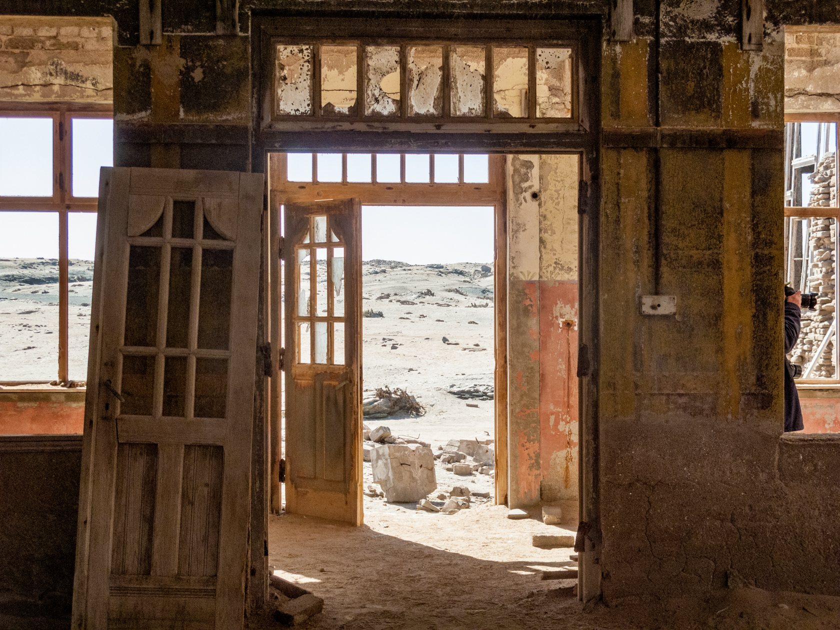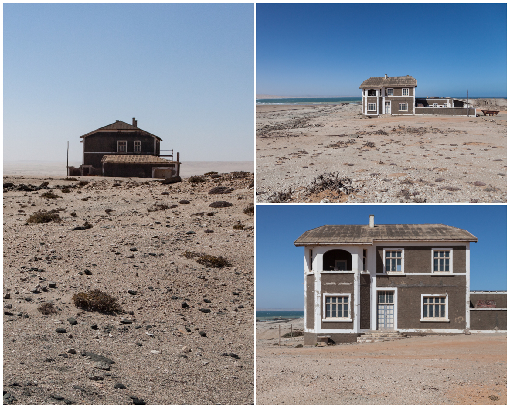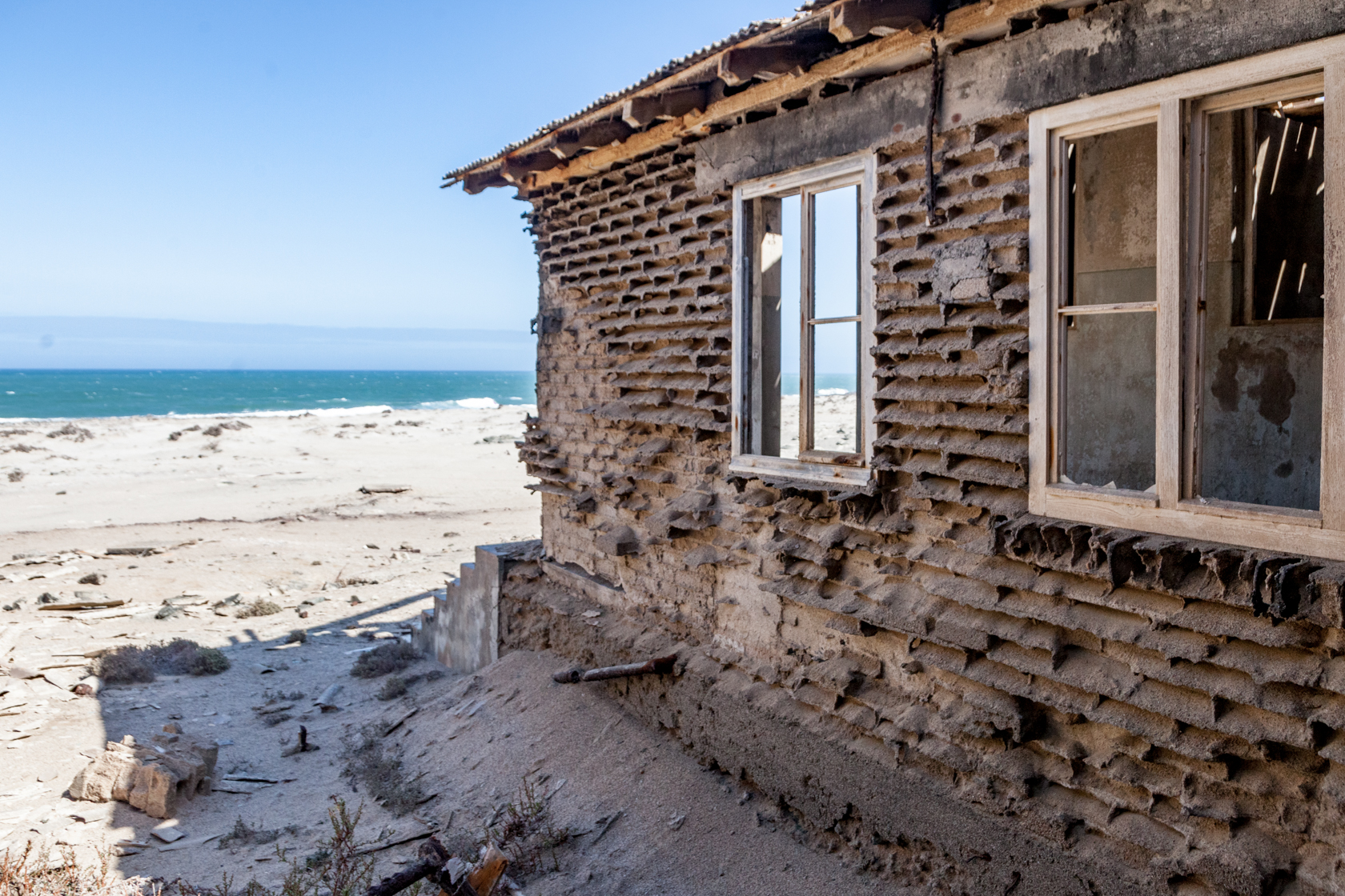 The area although in a desert is cold and windy blowing from the land to the sea. Rainfall rarely exceeds 10 millimeters annually and the resulting. The upwelling of the cold Benguela current results in dense ocean fogs for much of the year. The heavy surf pounds on the beaches. The climate is inhospitable. Walking through the deserted buildings I was lucky to see a Brown Hyena scurrying away in the distance otherwise the area seem devoid of other animal and plants. Bricks have been hollowed out and timber sandblasted by the constant wind blowing. Yet at one time families lived here making a life for themselves. It’s hard to believe that most houses had a garden and a touch of greenery when the mine was operational.