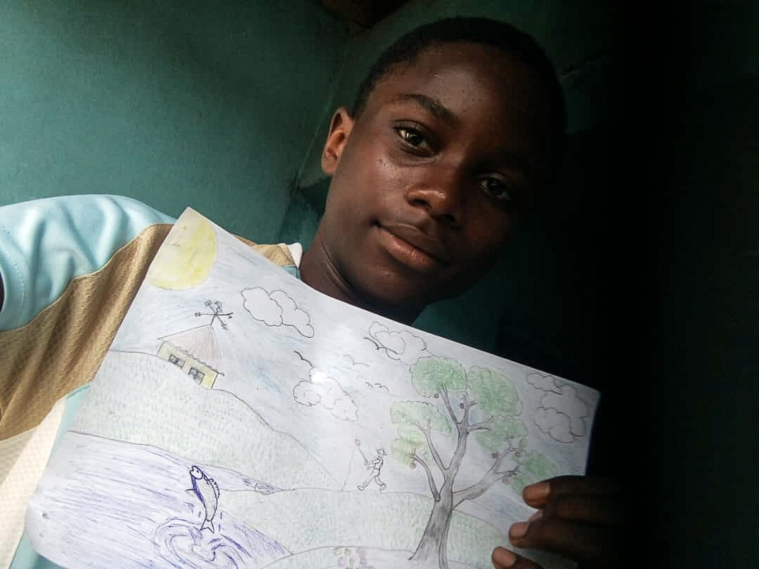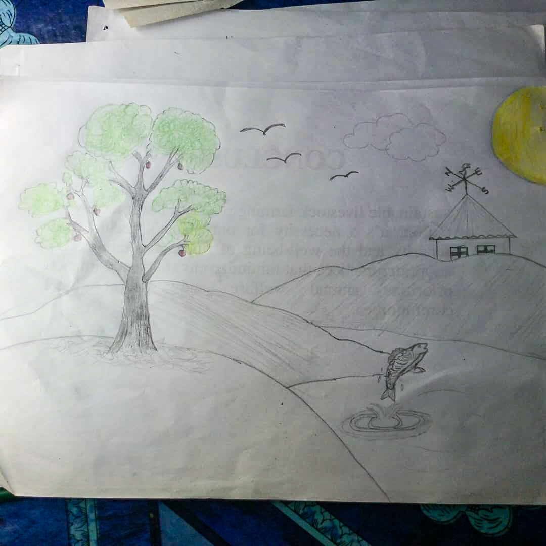 Then I went on by drawing the mountain. It's partially a hill; actually, there are only three hills in my drawing, and each of the hills has grass on them. I will personally call it grassland. The most dominant colour in my drawing is green, because it actually deals with nature, but that did not make it a full ecosystem. I drew a river; you might likely call it a sea or an ocean. To complete it, I drew a fish diving out of the water, which caused the water to resonate. This shows that there are living things also in the river, which was not drawn by me.