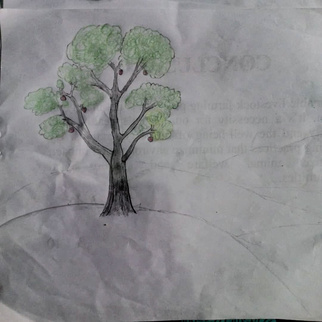 At first I was confused about the kind of nature drawing I should do, and this one below got into my mind. I was thinking of the best paper to fix in my drawing; fortunately, I found one. I started by drawing a tree at the left side of the paper, and then I drew the tree leaves. Since it is a monocot plant, I did a scam leaf. After drawing the lives, I decided to put in some red fruits. Guess what? It's an apple tree.