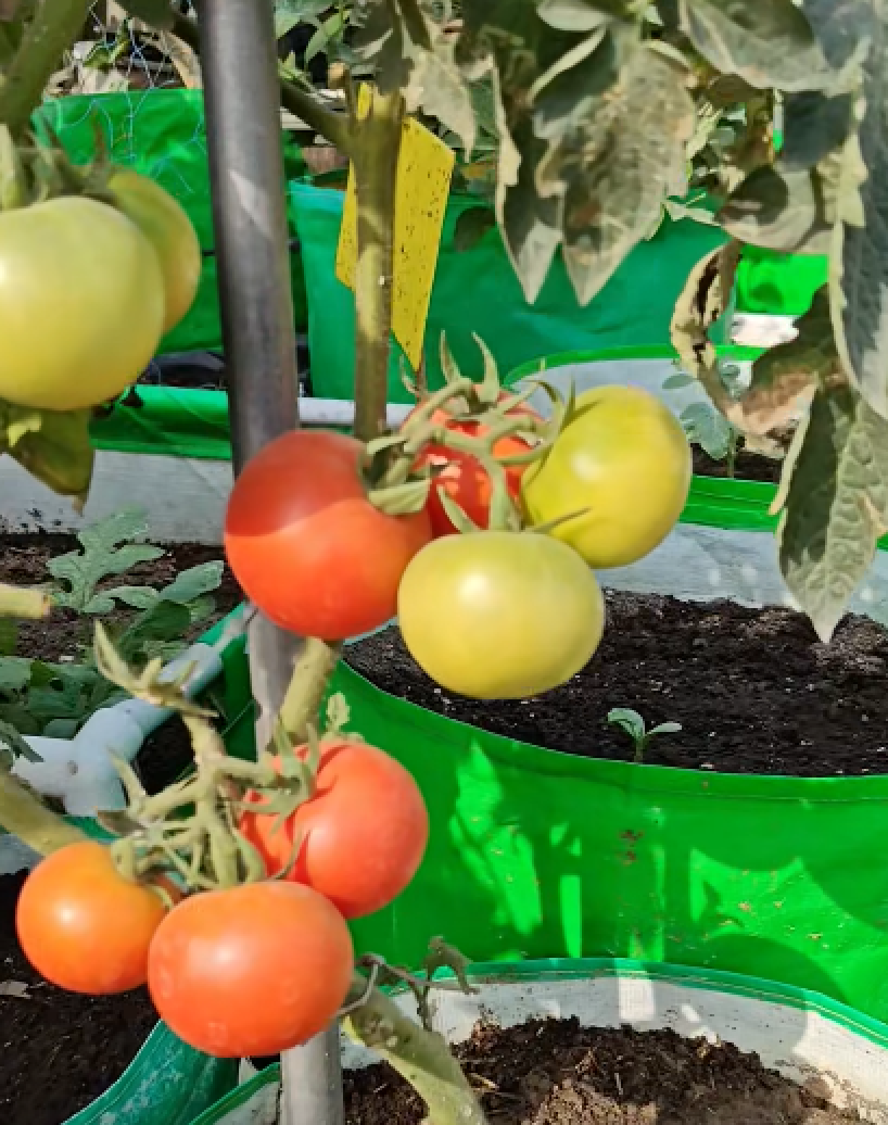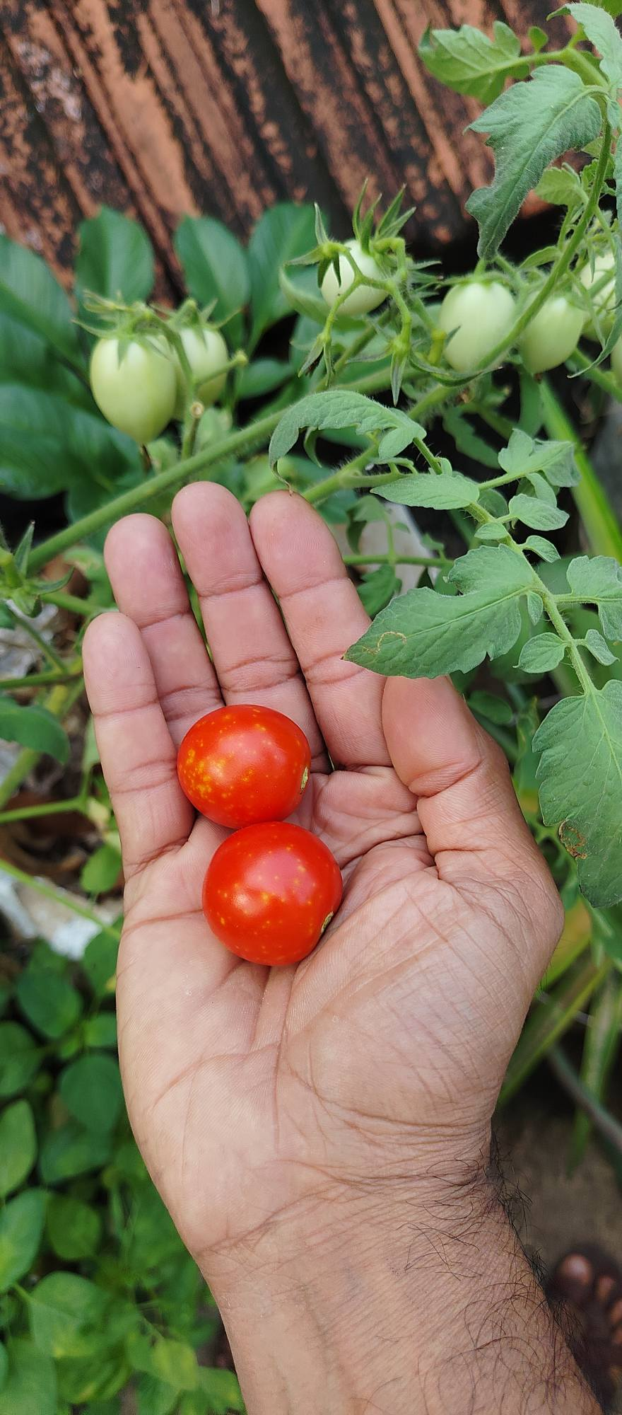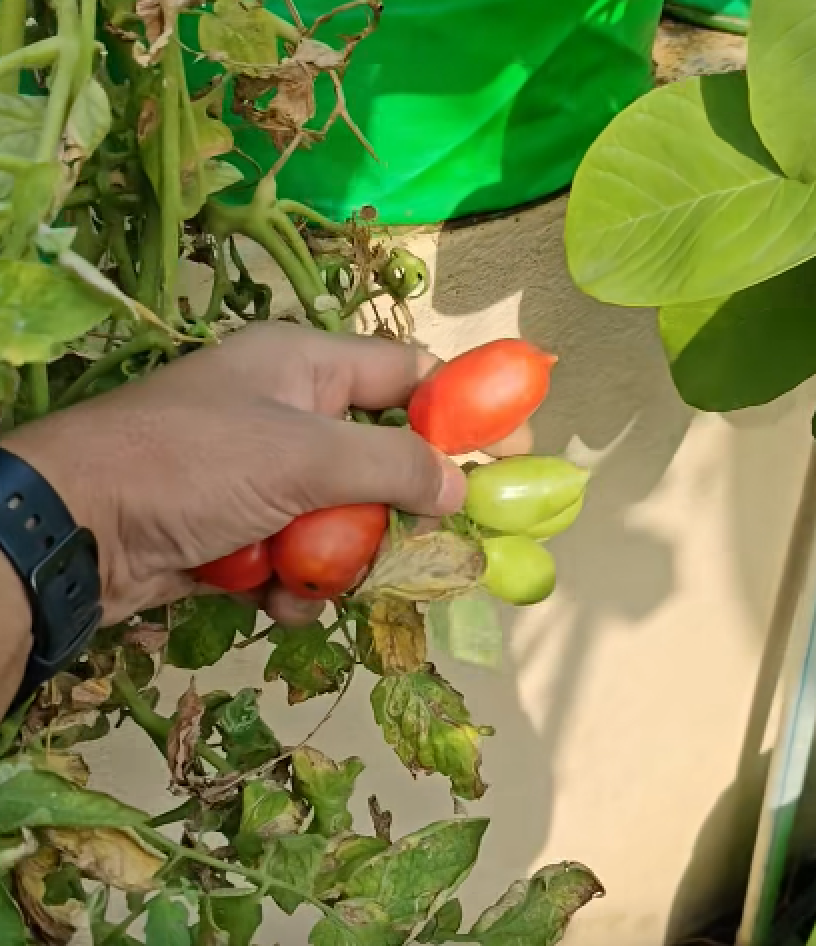 A continuación, pasé a los tomates. Son las estrellas de mi terraza, madurando hasta adquirir un color rojo intenso y brillante bajo el sol de la tarde. Recolecté un puñado de tomates cherry —repletos de un sabor concentrado— que están destinados a una ensalada fresca para esta noche. Junto a ellos, los guisantes están alcanzando por fin su punto óptimo. Desgranarlos es un proceso meditativo, y esas esferas de un verde vibrante son el complemento perfecto para una ligera mezcla de verduras salteadas.