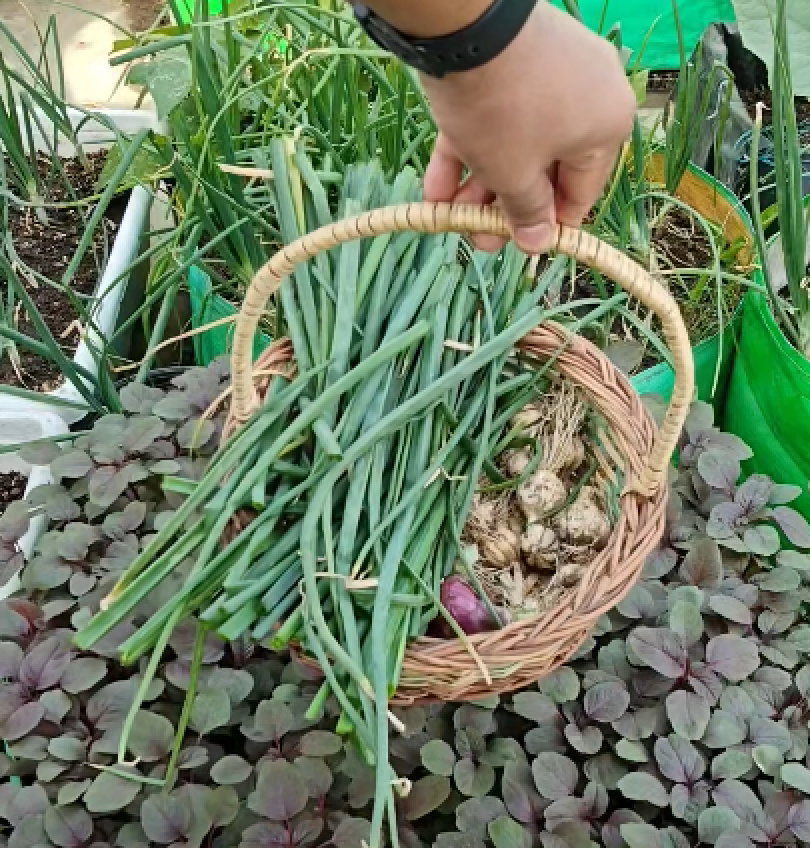 También extraje unas cuantas cebollas blancas de sus macetas. Cosechar hortalizas de raíz siempre se siente como desenterrar un tesoro oculto. El aroma de la tierra recién removida, combinado con el olor penetrante y limpio de la cebolla, es el verdadero perfume de una cosecha exitosa.