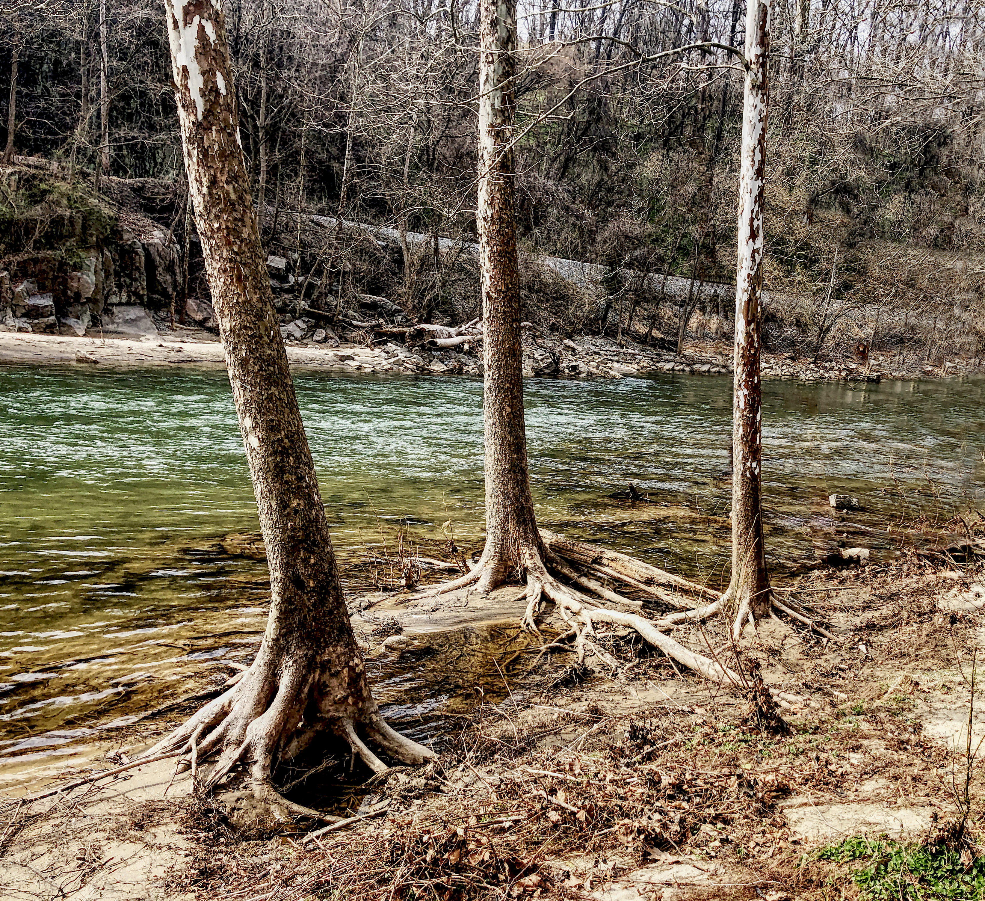 You can see the result of the two record breaking floods of 2016 and 2018 all along the river. The trees along the edge have had their roots exposed and many have tumbled into the strong current.