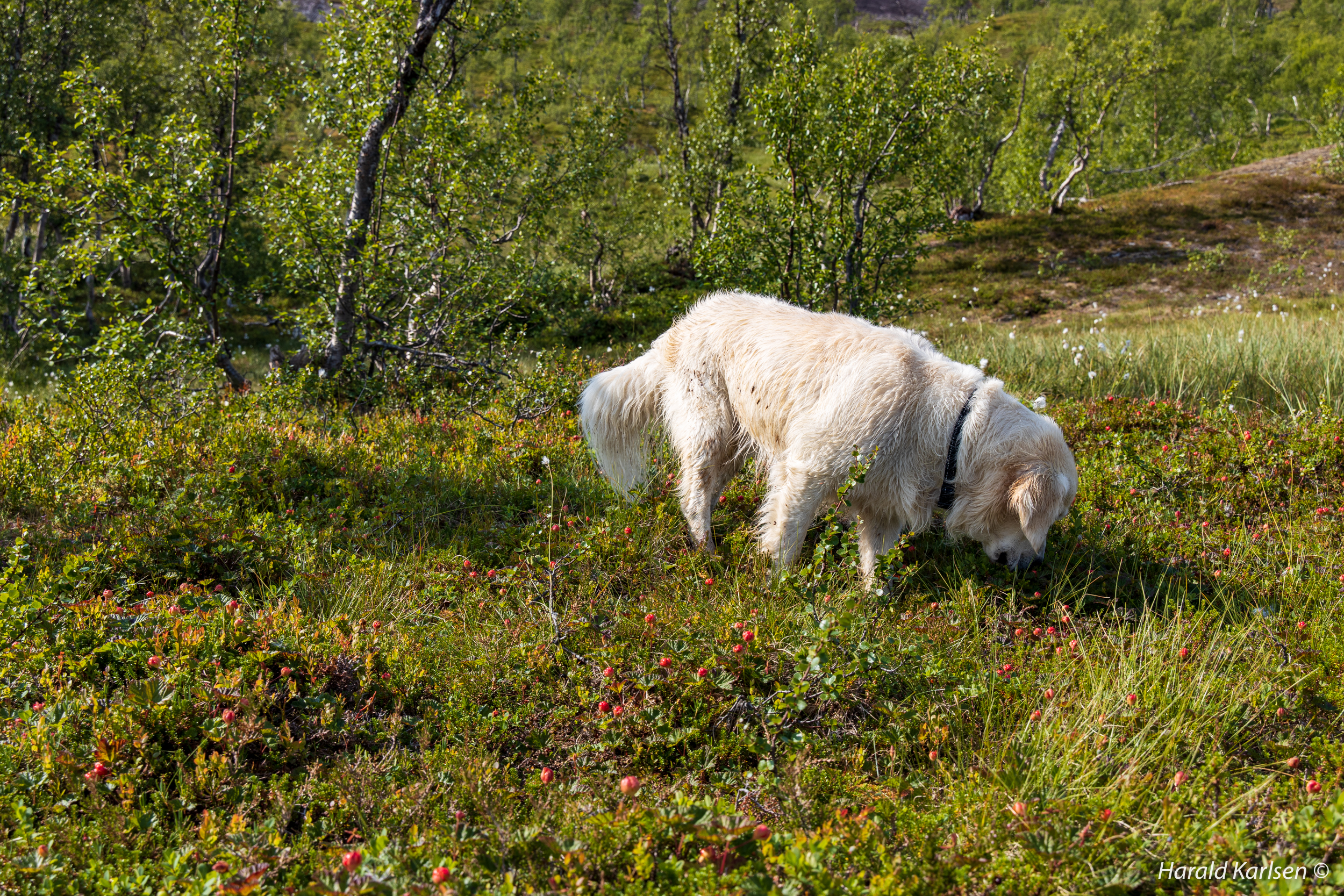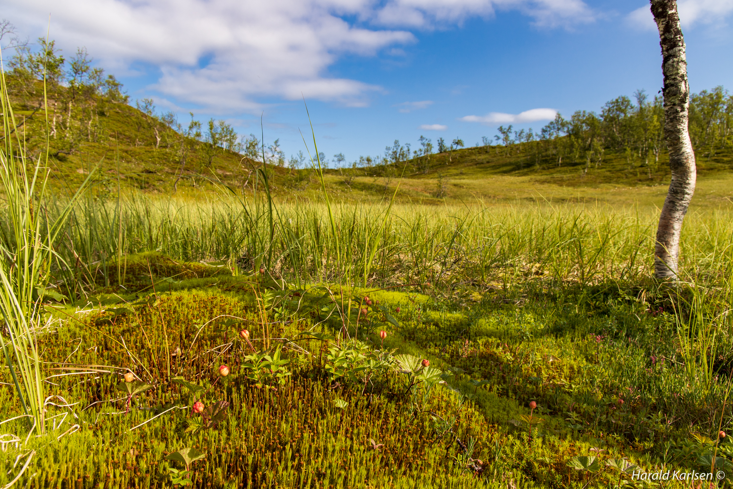 We took a little walk this morning checking the possibilities for cloudberries. We saw some but a little to early to pick, pithing a week or two they may be ripe. Today I picked 9 berries and 12 pictures. My wife picked some more, enough to eat with cream as dessert. As you see the weather is nice and the coffee tasted good in the sun.