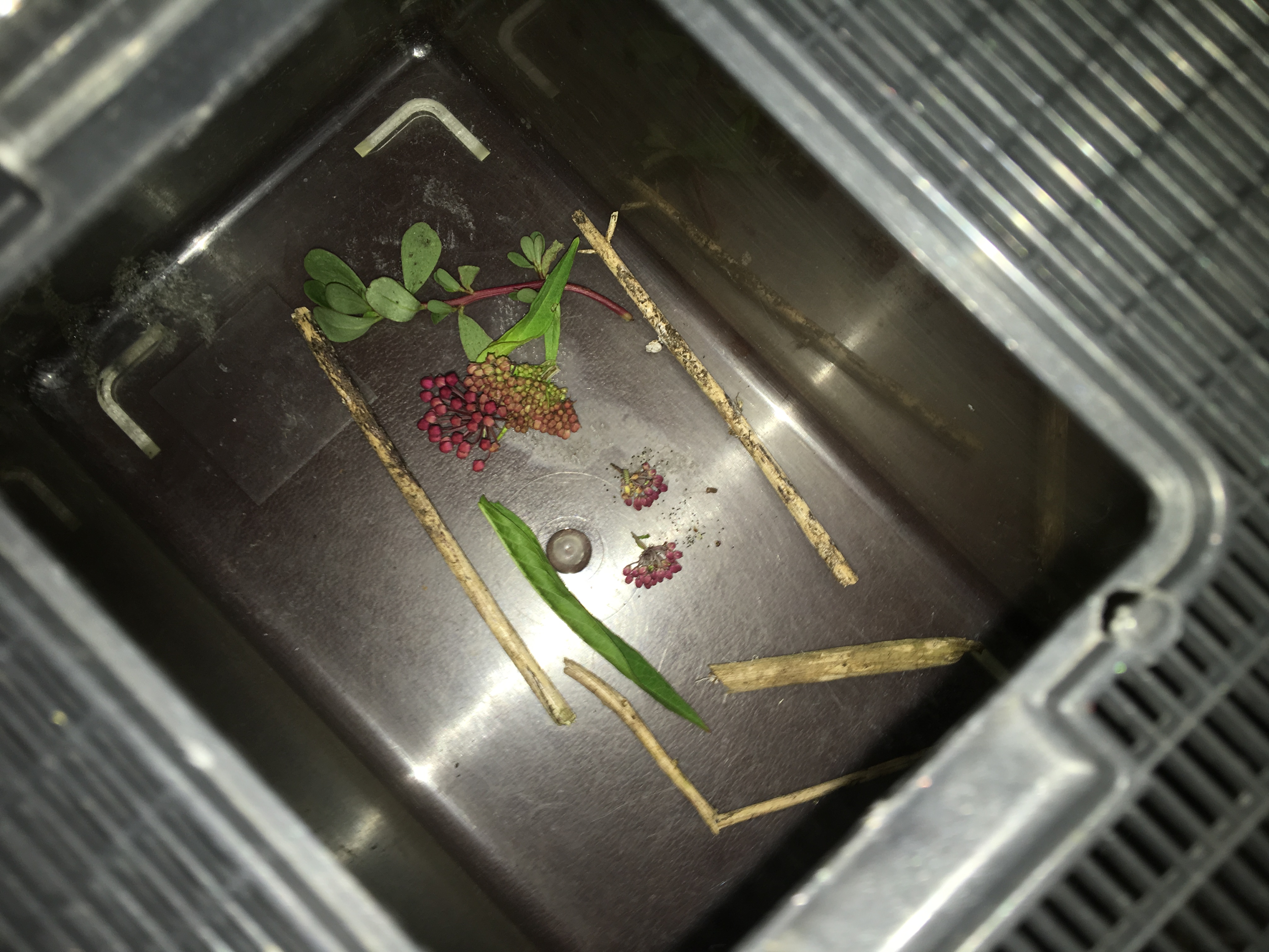 Every summer I bring in young monarch caterpillars from the garden, and carefully feed them, clean their cage, and give them a nice place to make their chrysalis when they are ready. There are two caterpillars in the picture, if you can find them.....