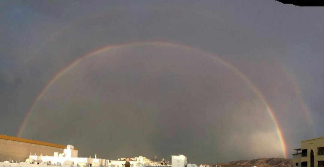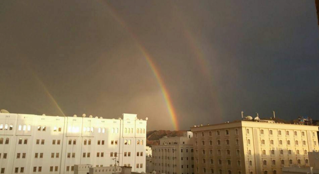 This was in Feb when I was in Muscat for around 10 days. I was returning back from hospital and was already feeling little low with the days events, just minutes after reaching home it started raining heavily, for almost half an hour it kept pouring. Weather got little chilly and as usual I was sitting with my cup of tea in my balcony. It was so very pleasant. After it stopped raining there came out this beautiful rainbow. And to my delight it was not one but a double rainbow.