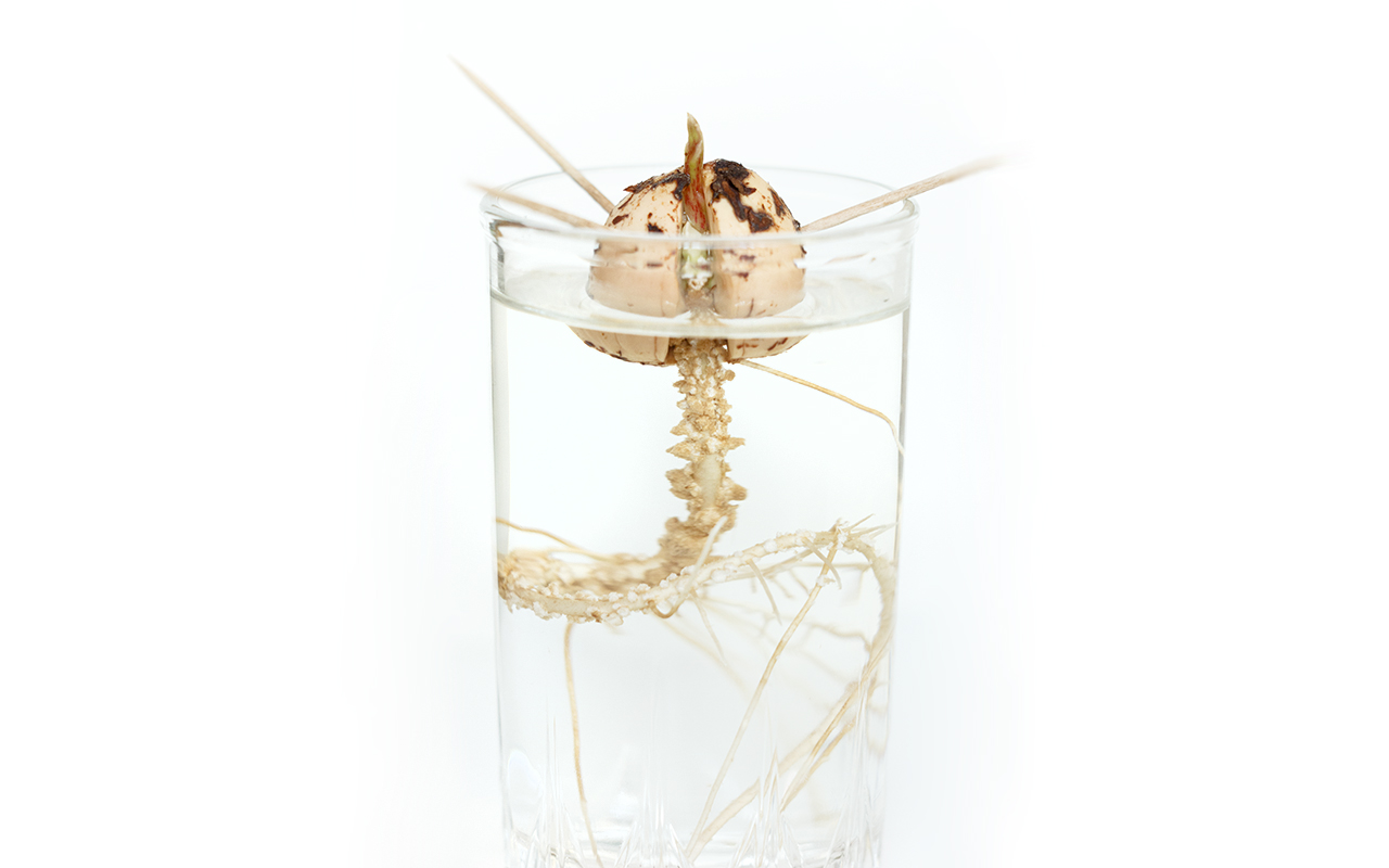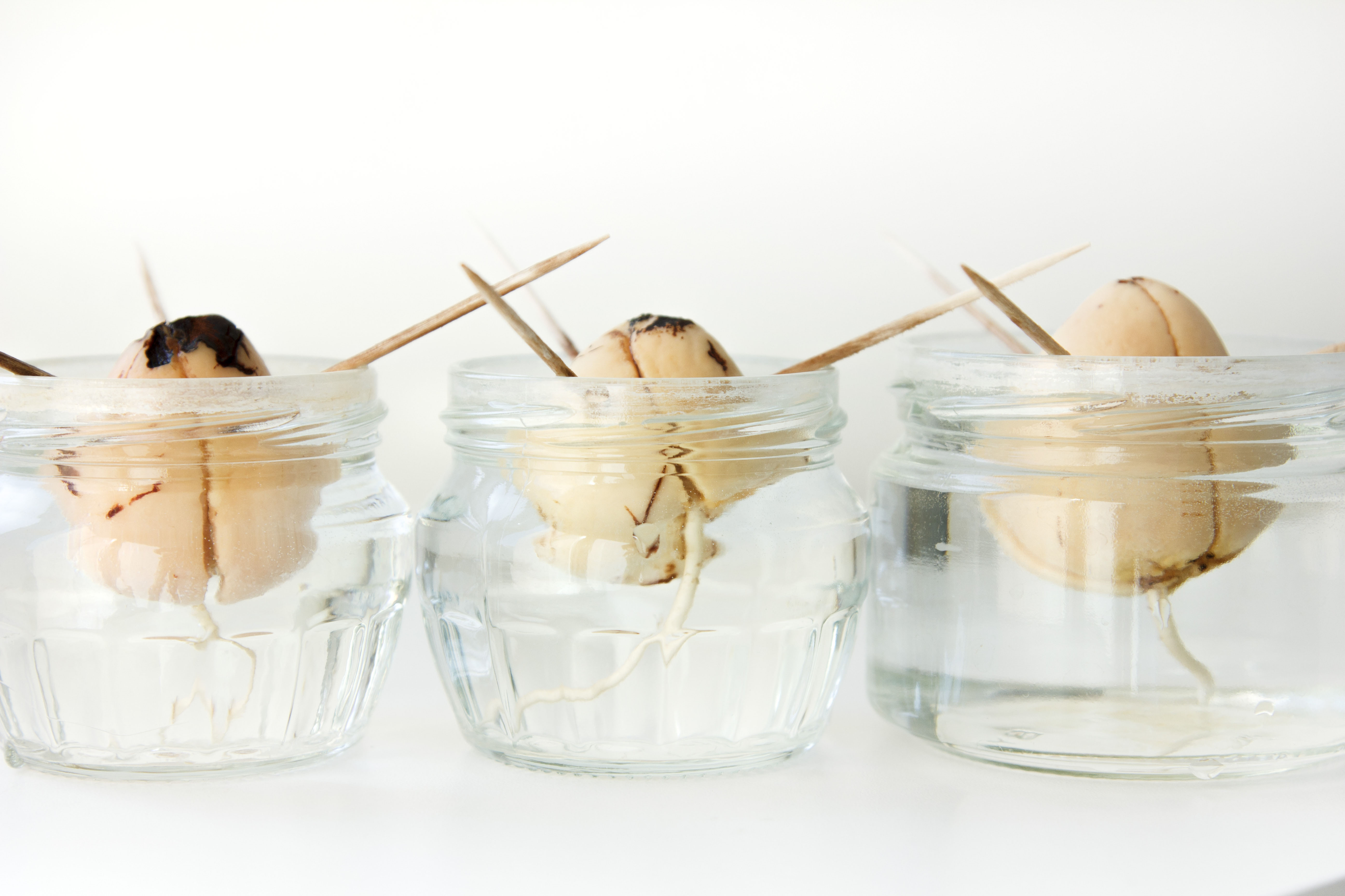 Immerse the seed in the water halfway through the blunt end, put it in the penumbra and be patient. Do not forget to change the water in the glass and monitor its level.