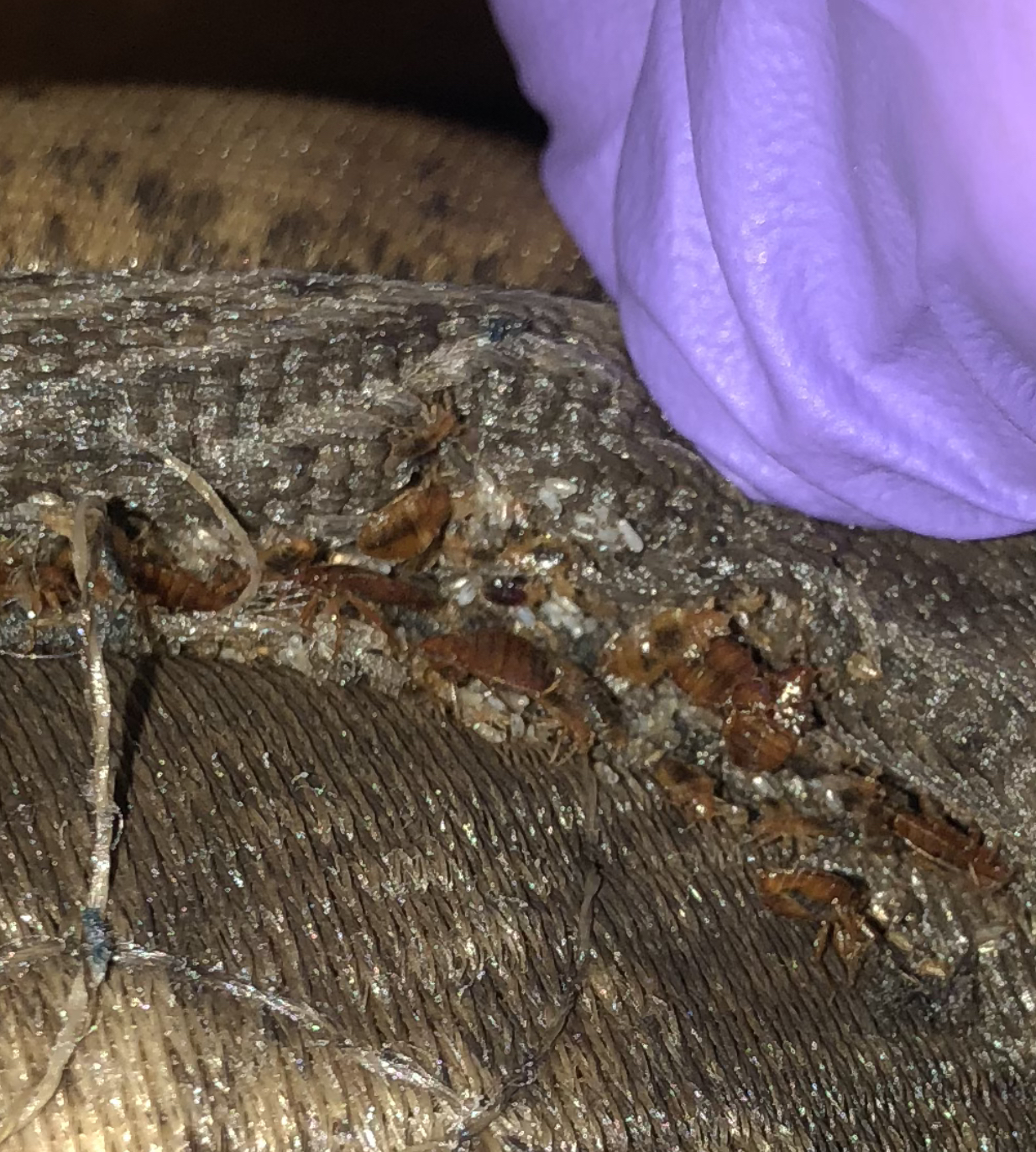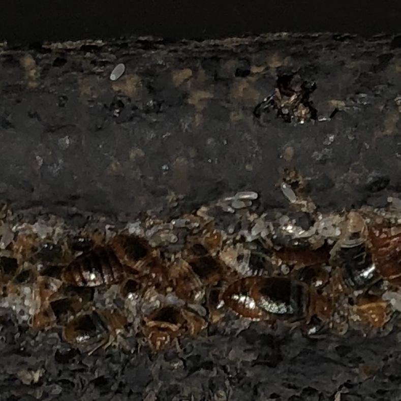 Also if you look in between the bedbugs you can see eggs scattered throughout the harborage site. These will all eventually hatch and become new bedbugs.