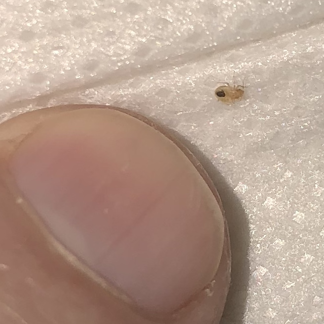 Bedbugs go through approximately 5 to 7 stages, or what we call instars. This is when they take a blood meal and after a period of time molt (she’s) their skin and grow to the next size. They do this until they become an adult and are old enough to mate. This one pictured above, had hatched from an egg not too long ago and has already taken its first blood meal. It also utilizes human blood, not only to create its new exoskeleton, but also to survive. Like humans, insects need moisture in order to survive. How can I tell it took a blood meal? Due to the fact that this insect is young and iridescent in color, you can see the dark spot within its abdomen. This is digested or partially digested blood. It will eventually “poop” it out and leave a spot that looks like tar on its surrounding environment.