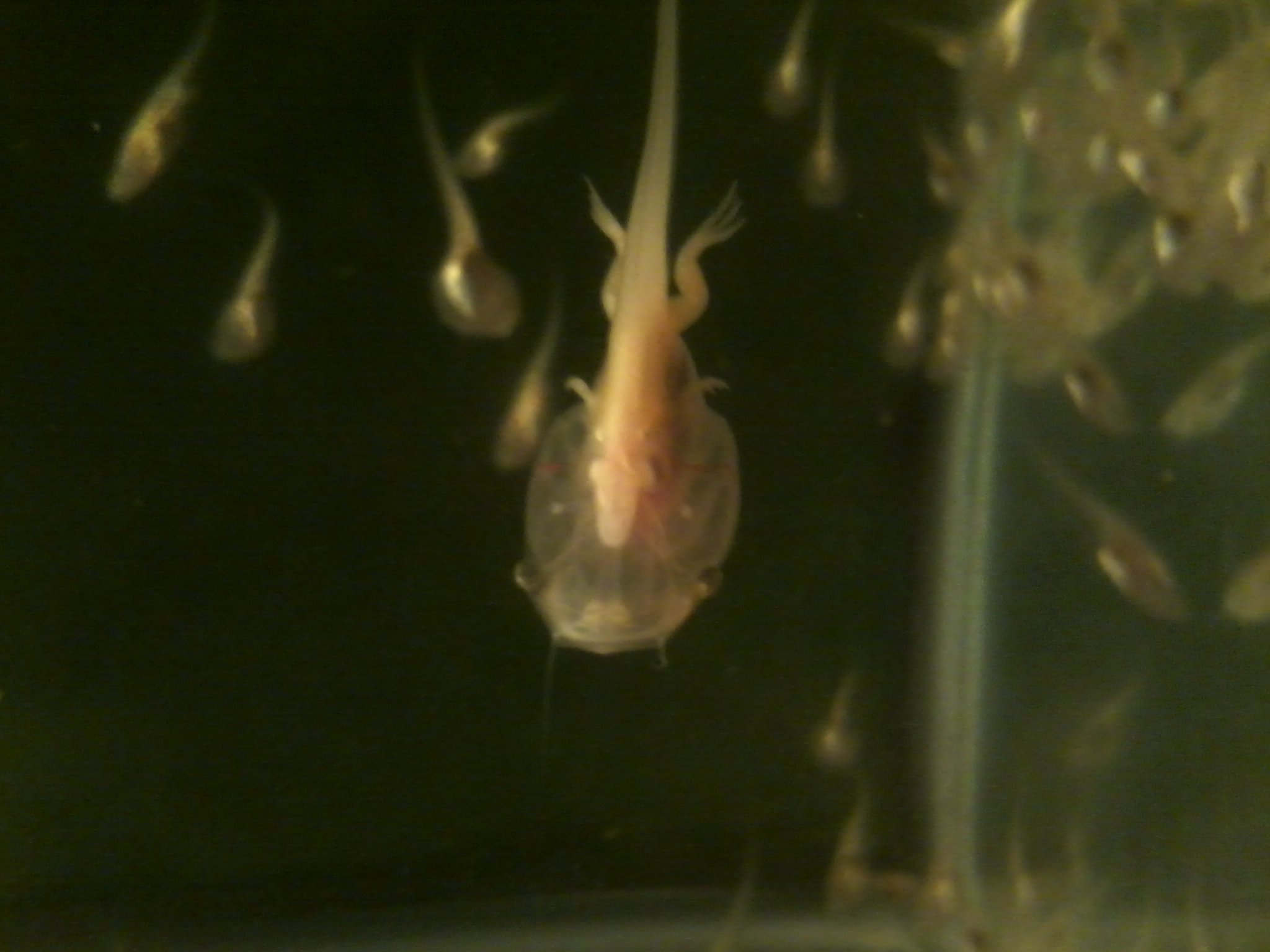 Around 3 of the most advanced tadpoles have now grown out the stubs of their arms to the point that fingers are visible. This places them firmly at NF stage 58. By tomorrow, we can expect to see their elbows sticking out and strong separation of their fingers occurring. The next week will see a tremendous amount of development occur as their legs continue to grow, their arms lengthen, and by the end they'll lose their tadpole heads as they become full-fledged froglets. Fun times ahead!
