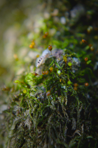 It was a little bitty thing - maybe 5 mm long - and my macro lens adapter had a hard time getting up close and in focus. When I was going through my photos back in the house, I found this one. Technically, it is a pretty horrible shot, since I was aiming for the spider but completely missed. But, I really like the way the little saprophytes kind of hover over the moss.