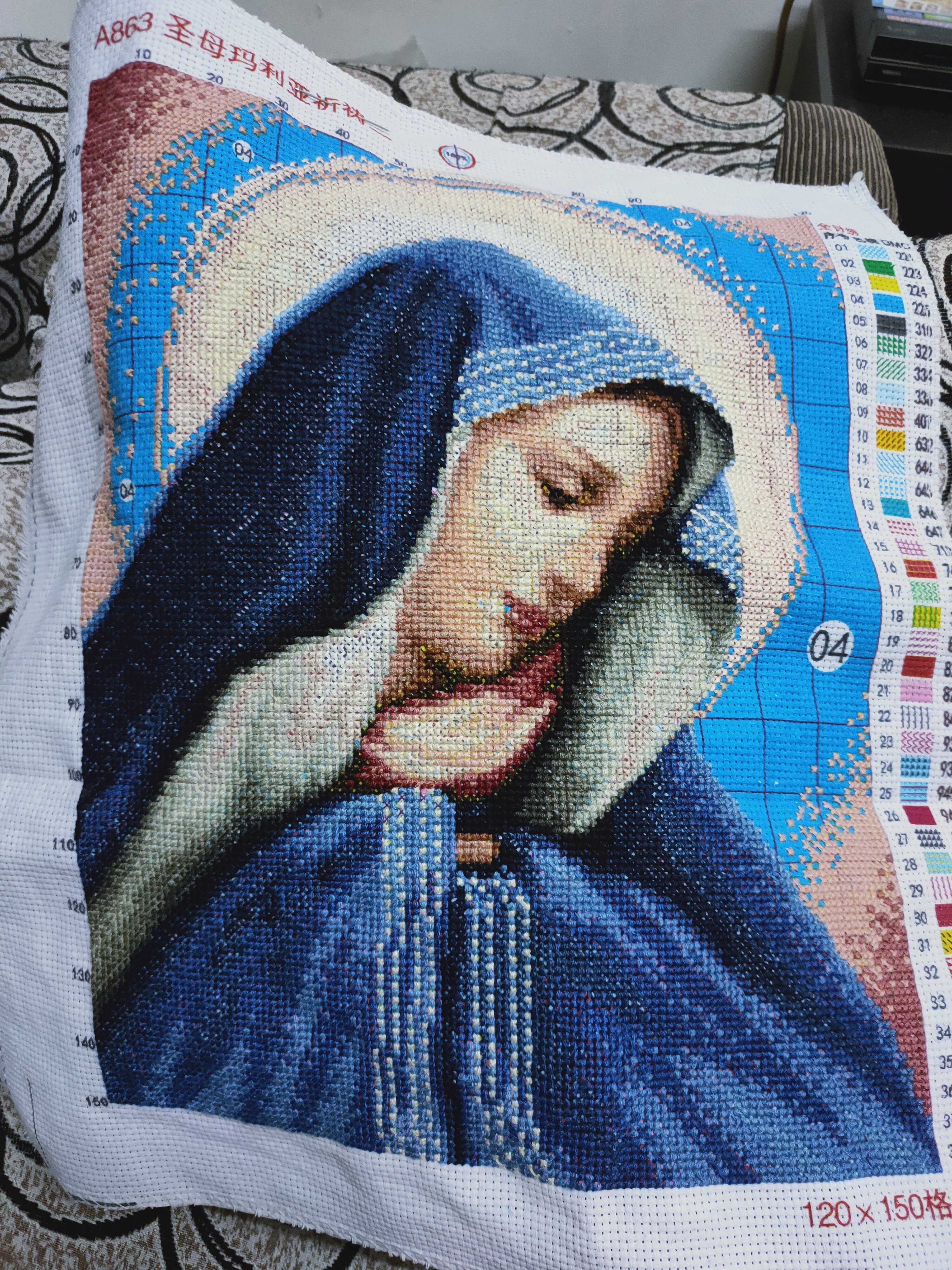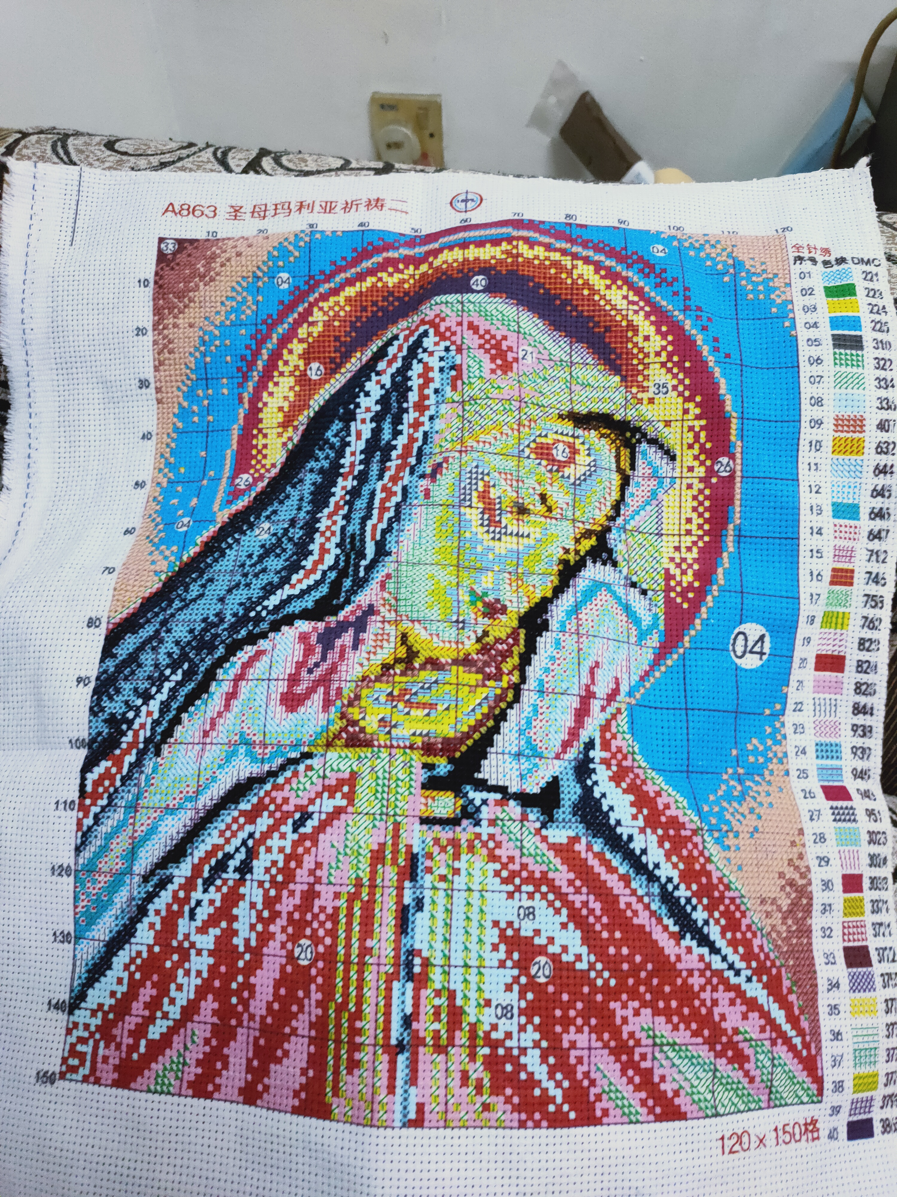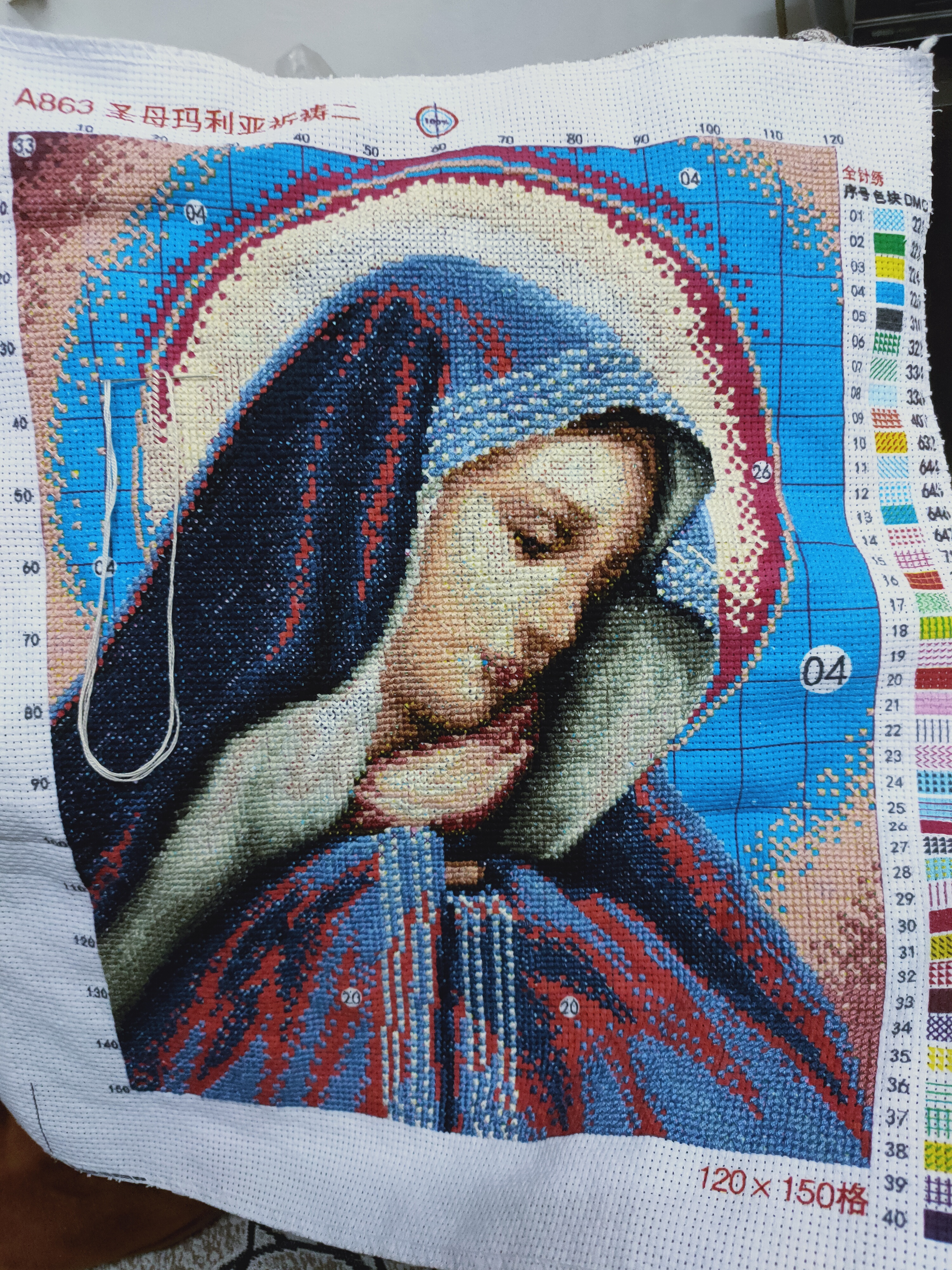 This is lockdown day 33, and I almost finish. You see the blue area, that is for light pink threads. Before that, the result was: