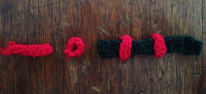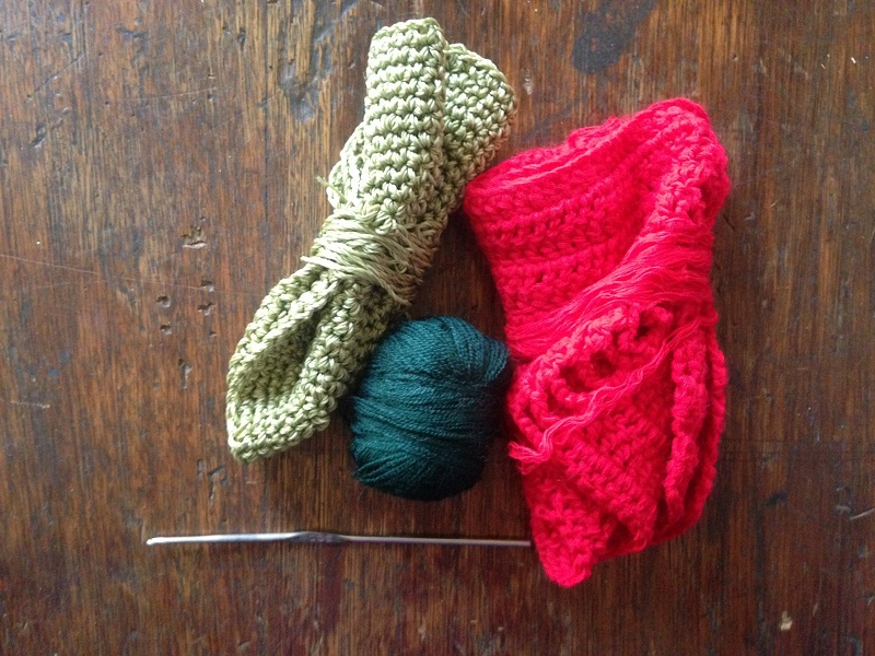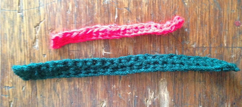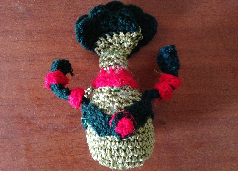 -For the arms make a simple chain of the length that you think is convenient from two rows of single crochet stitch with dark green wool.