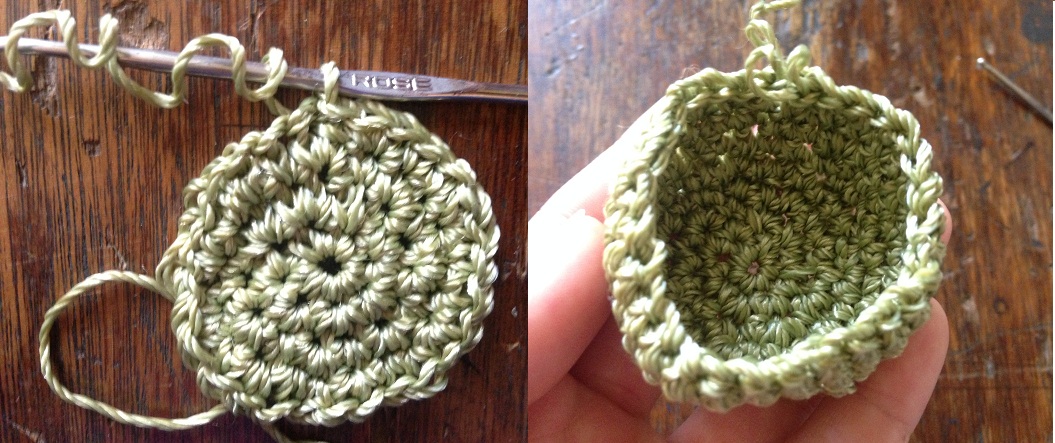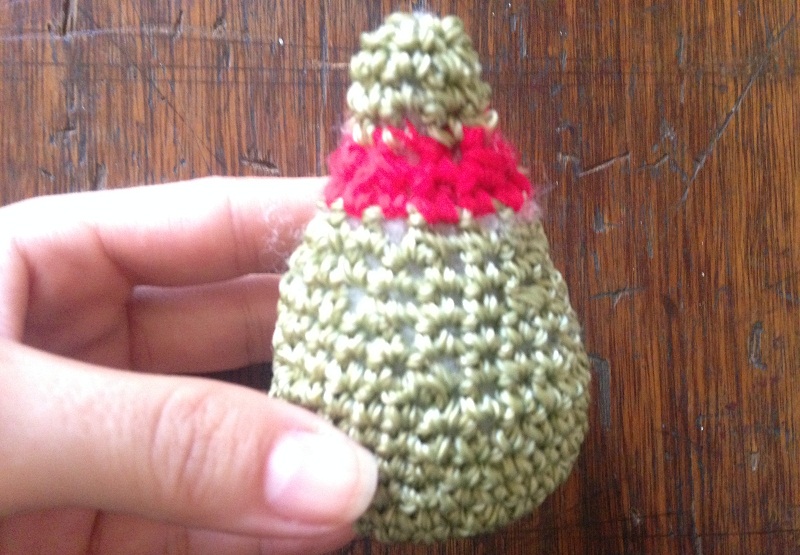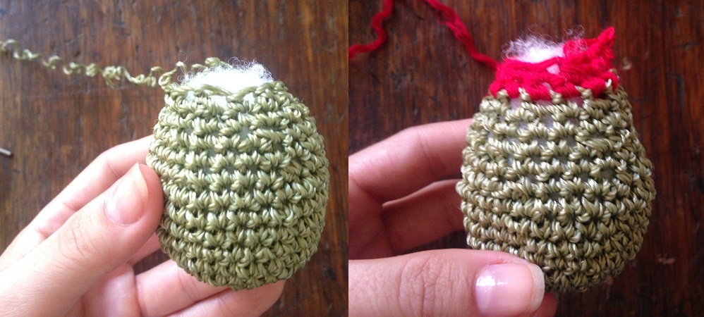 -For the ring. With light green yarn, make a simple chain started from the body of the fabric and make three points inside the ring to join it to the fabric.