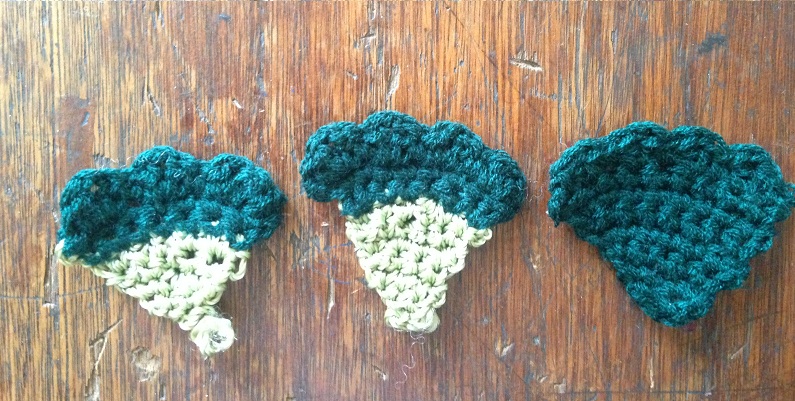 -The top part we will make as a kind of leaves with light green we will make a simple chain of 4 points, we make 3 single crochet stitch and we will start making increases in the next row in the two corners to obtain 5 points, the third row will be only points, the fourth increases in the corner to have 7 points, the fifth single crochet stitch, in the 6th we change color to dark green and we make two increases to have 9 points, the 7th of onlysingle crochet stitch and finally the 8th will begin with a single crochet stitch , the next point we make two doble crochet stitch at the same point and then a single crochet stich at the next point and so on until the row ends. This will be repeated three times.