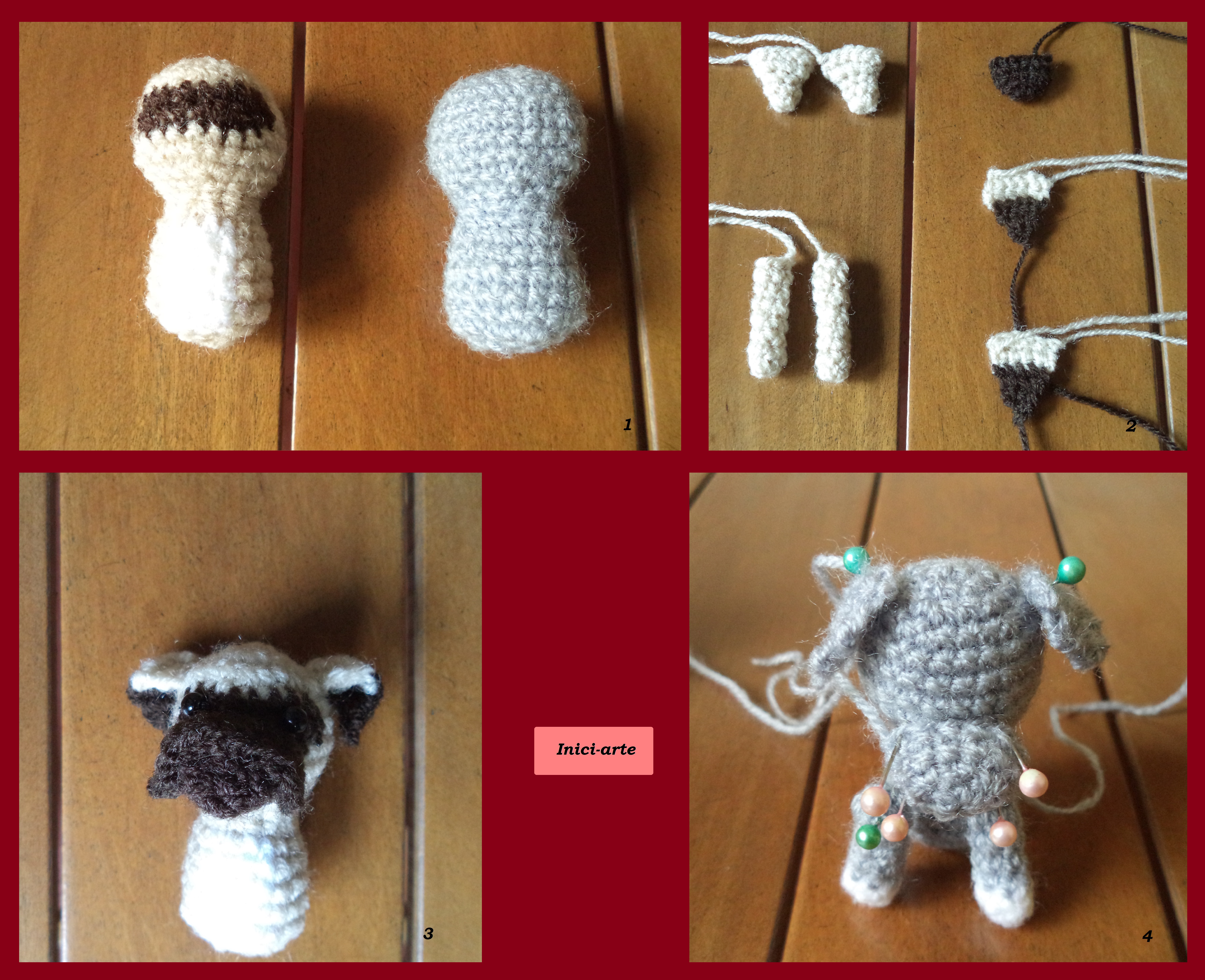 Se comenzó tejiéndola cabeza y cuerpo, ambos son de una sola pieza. Seguido de las extremidades, orejas y hocico. Para el armado de la cabeza se cosieron los ojos, el hocico y las orejas. Estas últimas varían en su posición según la raza de perros.