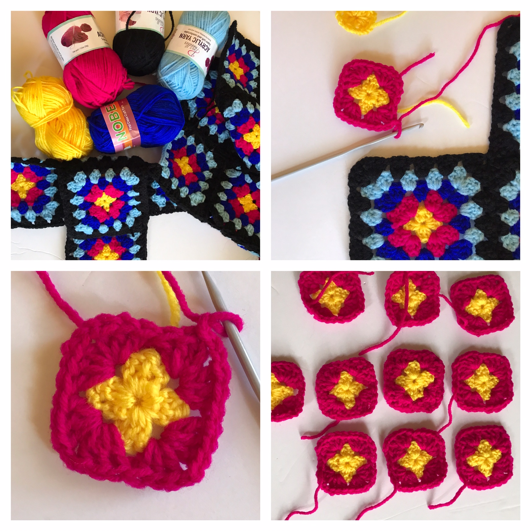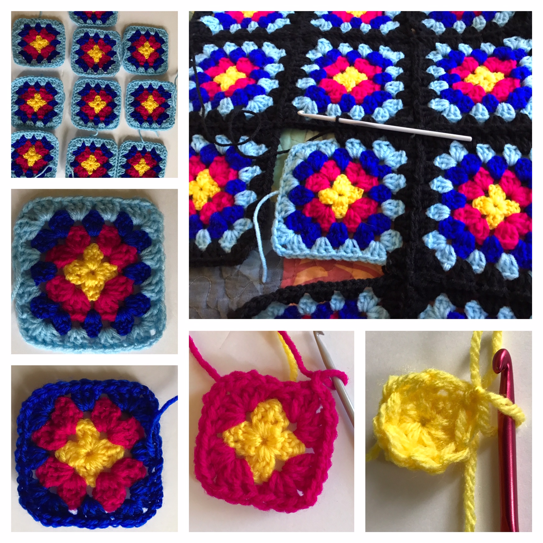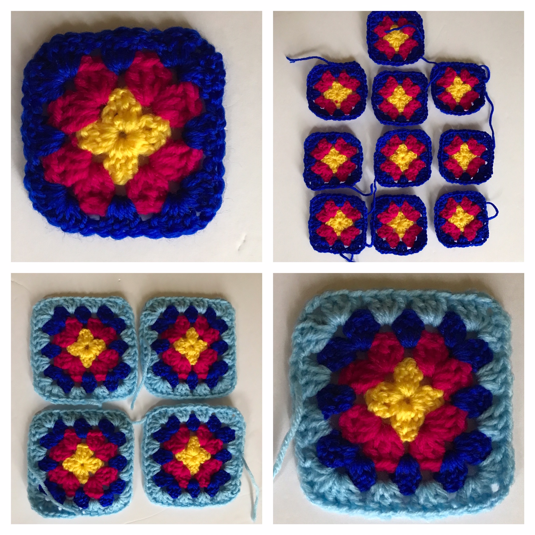 The center is yellow, I made a regular double crochet circle with 3 DC, chain 2 pattern. The second row is bright fuchsia, same 3 DC shells, with chain 2 in between at corners. Row 3 cobalt blue, row 4 light blue.