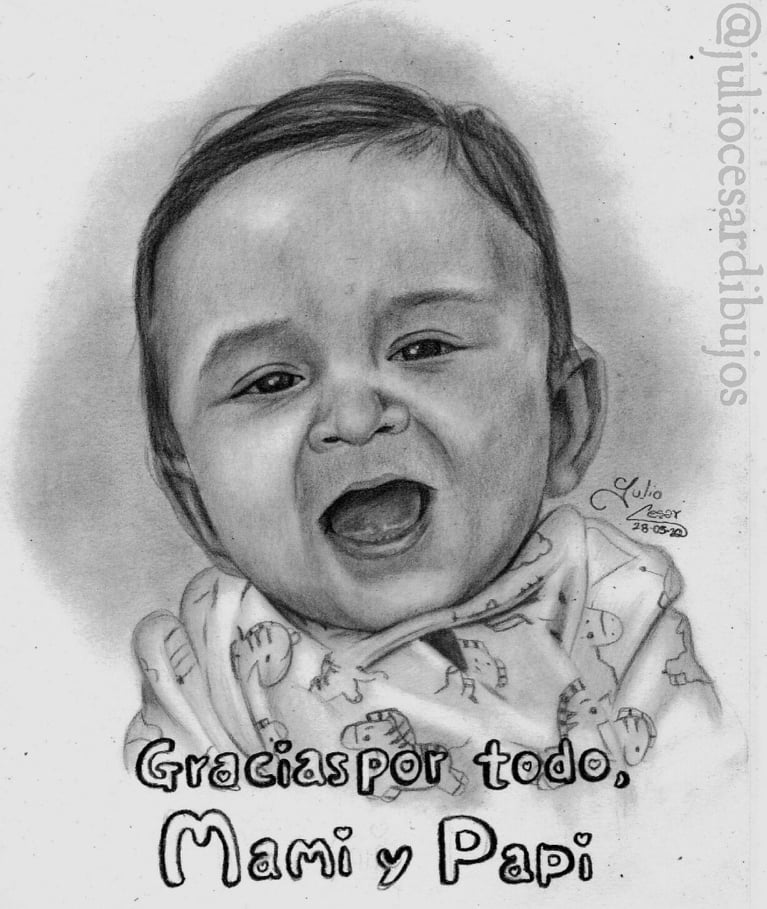 Este dibujo fue una comisión hecha con el hermano de la mamá del niño, quería hacerle un regalo sorpresa a los padres del bebé, y por eso también me pidió que le escribiera ese mensaje.