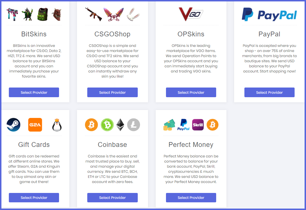 After you have earned a lot of points you can choose to withdraw your earnings, to maybe bitcoin which you can buy steem with. Or if you don't want steem, no problem you can still choose one of the other 6 payout methods which you can see down below: