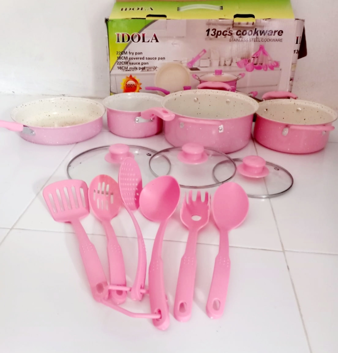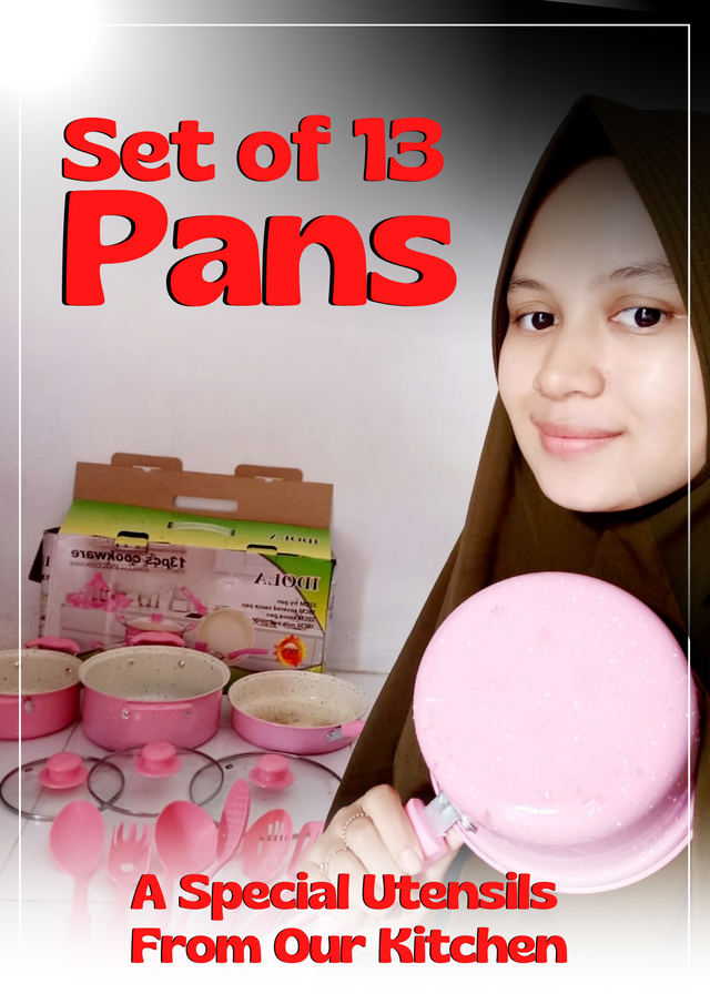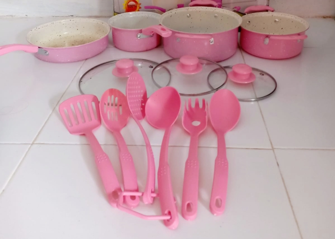 My favorite kitchen utensil is a set of 13 pans. I have several types of pans with their respective sizes and functions. The pot set of 13 is made of enamel which makes it non-stick. Here are following the details: