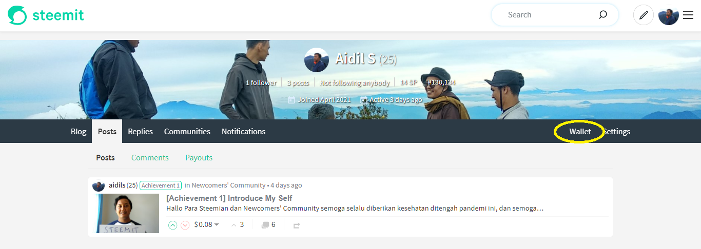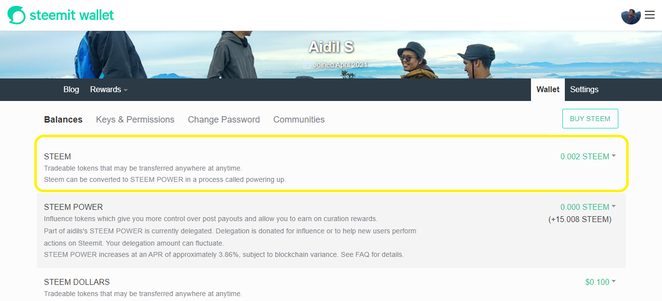 Login menggunakan Active key, jika berhasil maka akan tampil seperti berikut ini, kalian akan melihat beberapa menu wallet steemit disini, namun kita hanya berfokus kepada STEEM