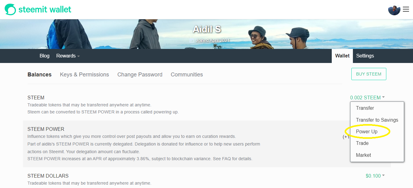 Untuk melakukan Power up pastikan kalian memiliki sejumlah STEEM, karena untuk melakukan Power Up, kalian harus mengkoversi STEEM kalian pada menu Power Up di STEEM, lihat gambar berikut ini,