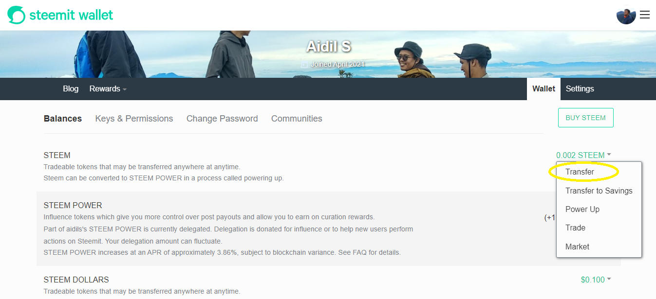 Jika kalian ingin melakukan transfer STEEM, kalian bisa pilih menu drop-down, lalu pilih Transfer
