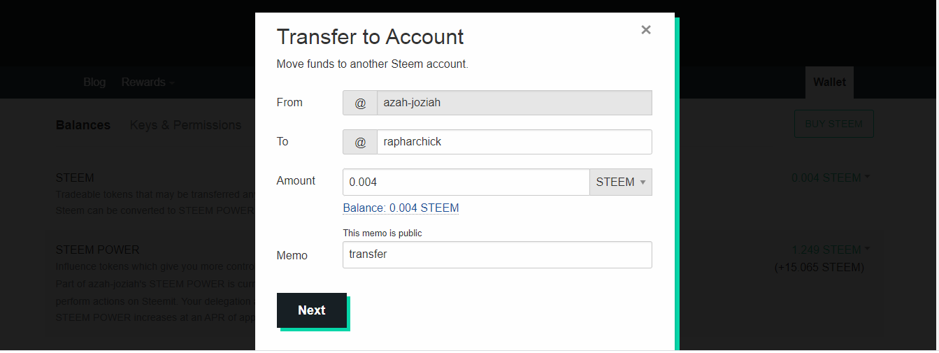 Another dialogue box will appear to input the account name of the receiver or beneficiary, the amount of steem and a public memo.